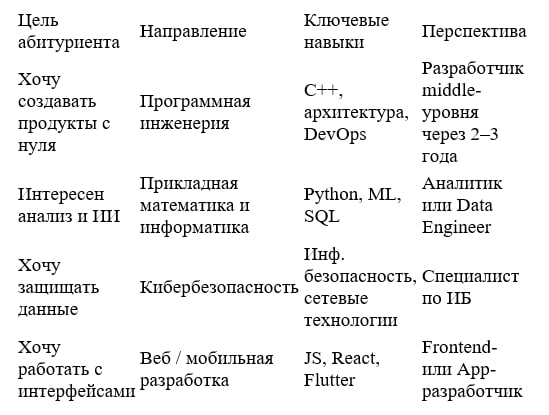 Каждое направление развивает свой набор компетенций. Тот, кто выбирает программную инженерию, учится мыслить системно; в прикладной математике и информатике больше аналитики и статистики; а треки по кибербезопасности дают понимание, как защищать цифровые данные и инфраструктуру. Для визуалов и тех, кому ближе взаимодействие с пользователем, подойдёт веб-или мобильная разработка.