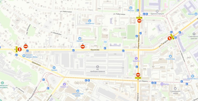 В связи с этим с 9:00 до 11:00 будет ограничено движение транспорта на перекрестке улиц Карла Маркса, Крымова и Гагарина, а также на участках улиц: