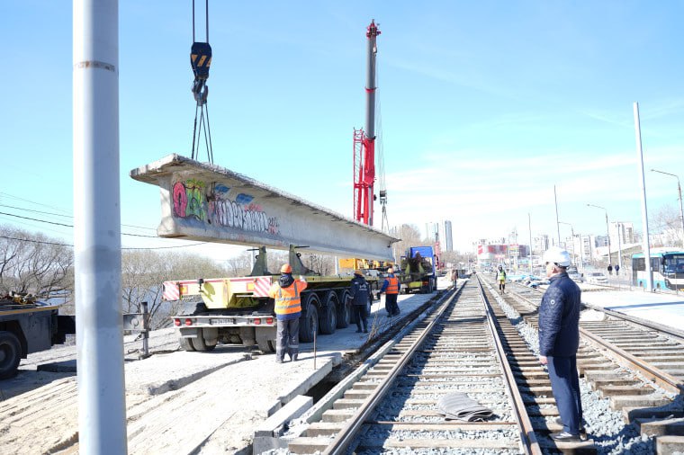 Сборка новых трамвайных путей от улицы Минаева до Московского шоссе завершена. До конца недели планируется тестовый запуск трамваев на этом участке.