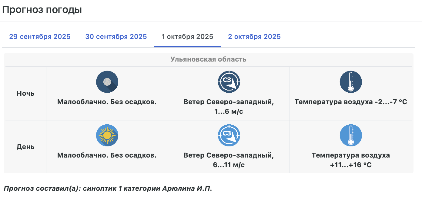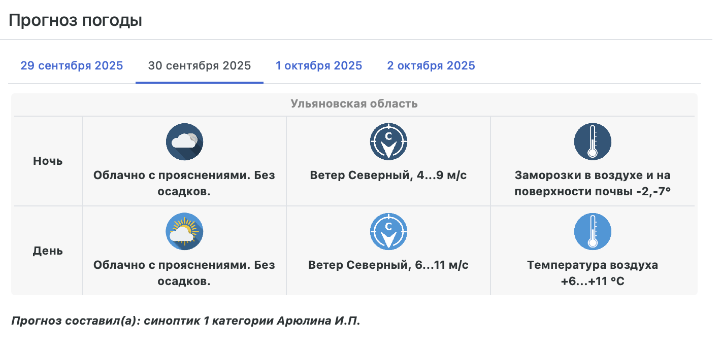 Во вторник, 30 сентября, днем температура воздуха составит от +6 до +11 градусов. Ночью столбик термометра опустится до — 7 градусов. Ожидаются заморозки в воздухе и на поверхности почвы.