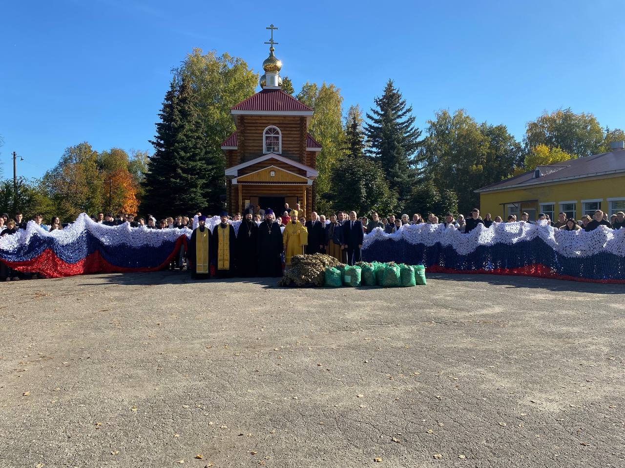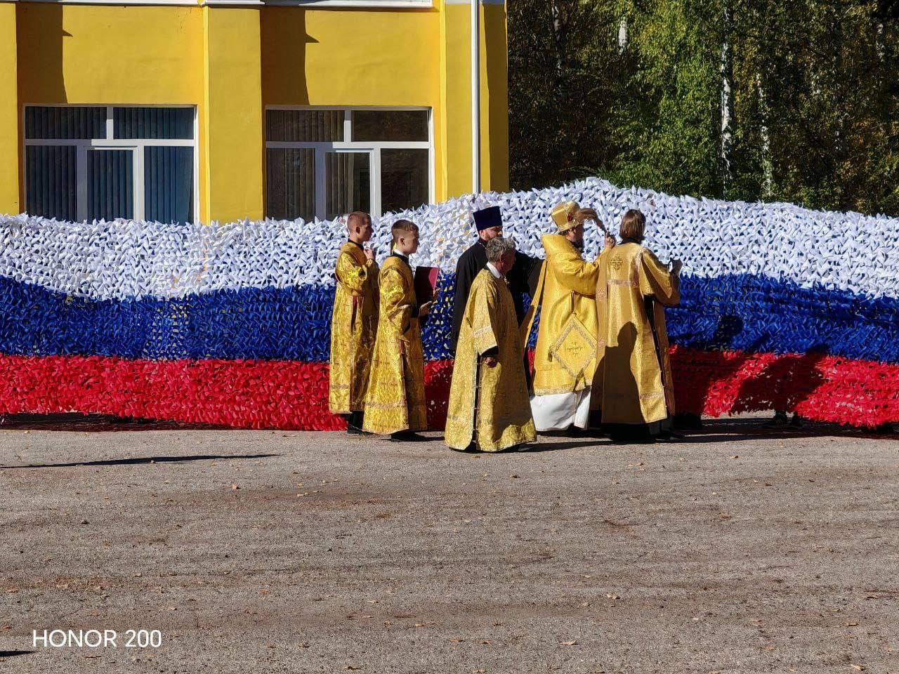 После торжественной литургии, посвящённой памяти Сергия Радонежского, был освящён 100-метровый флаг, сплетённый в виде маскировочной сети студентами и преподавателями УлГАУ. Флаг будет отправлен на Поклонную гору в Москве и размещён на День Победы 9 мая 2026 года, символизируя единство и победу нашего Родного Отечества.