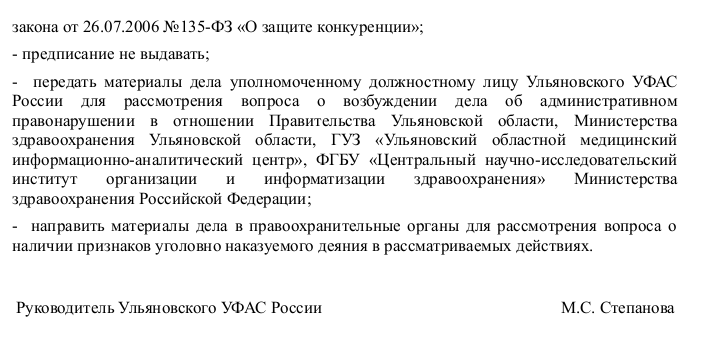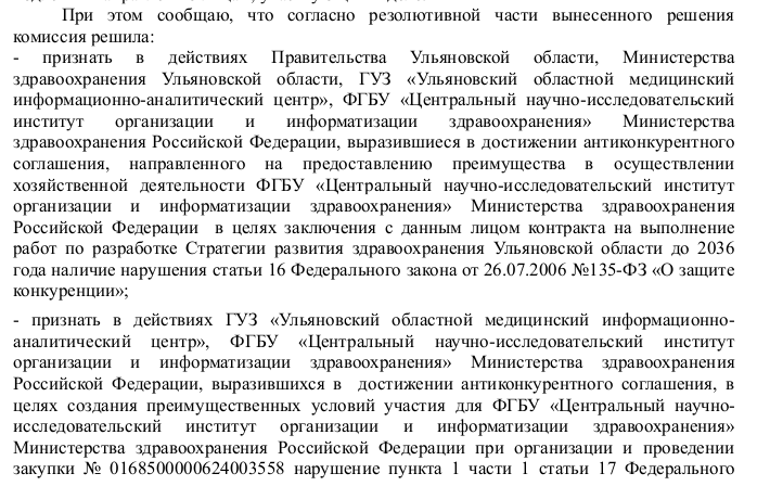 Ульяновские антимонопольщики нашли нарушения при заключении контракта Областным медицинским информационно-аналитическим центром на 15 млн рублей. Речь идет не о закупке оборудования или медикаментов, а о разработке Стратегии развития здравоохранения региона — документа, по которому ульяновцев должны лечить в ближайшие 10 с лишним лет. 30 сентября Управление Федеральной антимонопольной службы по Ульяновской области приняло решение по делу, участниками которого стали правительство Ульяновской области, министерство здравоохранения региона, ГУЗ «Ульяновский областной медицинский информационно-аналитический центр» и ФГБУ «Центральный научно-исследовательский По мнению Управления ФАС по региону, при проведении торгов между представителями Ульяновской области и федеральным НИИ было достигнуто антиконкурентное соглашение, позволившее Институту получить контракт. Речь идет о торгах на проведение научно-исследовательской работы по анализу и разработке стратегии развития системы здравоохранения Ульяновской области до 2036 года. Начальная цена контракта была обозначена в 15 млн рублей. На конкурс заявились два участника, второй снижал цену до 12 млн рублей. Но победителем стал Центральный НИИ организации и информатизации здравоохранения минздрава РФ, предложивший цену в 14,95 млн рублей, то есть всего на 0,33 процента ниже начальной. Раскрывать подробности нарушений в УФАС не стали. Согласно протоколам рассмотрения заявок, НИИ победило на конкурсе, несмотря на более высокую цену, за счет наличия у него опыта работы по подобным контрактам. При этом у его конкурента, в отличии от НИИ, был сотрудник с ученой степенью кандидата медицинских наук по специальности «Общественное здоровье, организация и социология здравоохранения, медико-социальная экспертиза», но этот показатель при рассмотрении заявок оценивался ниже, чем опыт выполнения работ. Контракт на разработку стратегии заключили в августе 2024 года, в конце прошлого года его исполнение завершили. «Улпресса» подробно рассказывала о содержимом получившейся Стратегии развития ульяновского здравоохранения. Документ подтвердил многолетние проблемы медицинской отрасли региона: кадровый дефицит, кредиторскую задолженность учреждений. Кроме того, Стратегия поддержала предложенную минздравом региона оптимизацию больниц и сокращение коек в медучреждениях. Для решения кадрового вопроса предлагалось «формирование многоуровневой системы мотивации медработников и модернизация службы главных внештатных специалистов». При этом об увеличени финансирования отрасли речи не шло. Торги на разработку стратегии были объявлены через 10 дней после назначения министром здравоохранения Ульяновской области Марии Шалягиной. Заказчиком выступал подведомственный минздраву Медицинский информационно-аналитический центр во главе с Ольгой Лаушиной. Лаушина сейчас находится под домашним арестом по делу о взятках. Выявив нарушение, Управление ФАС должно открыть административные дела против участников сговора. Кроме того, материалы проверки отправят в правоохранительные органы для решения вопроса о возбуждении уголовного дела. ![]() |