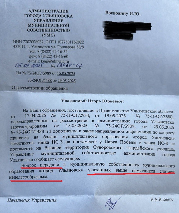 О том, что городские власти так и не выполнили просьбу общественников, в своем ответе еще в апреле написал зампред правительства Ульяновской области Вадим Андреев. На просьбу Улпрессы прокомментировать действия мэрии на момент публикации он не ответил. Также пока не дали ответа, почему принятие танков на баланс «нецелесообразно», и в администрации Ульяновска, куда мы направили запрос. По мнению заместителя руководителя Управления по охране объектов культурного наследия Евгения Сизоненко, город должен принять танки на баланс.