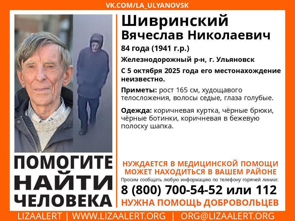 В Ульяновске ищут 84-летнего Вячеслава Шивринского. Он пропал 5 октября. По ориентировке поискового отряда «ЛизаАлерт», место его пропажи – Железнодорожный район. Приметы мужчины: рост 165 см, худощавого телосложения, волосы седые, глаза голубые. Был одет в коричневую куртку, чёрные брюки, чёрные ботинки, коричневую в бежевую полоску шапку. Шивринский – кандидат технических наук, доцент кафедры «Измерительно-вычислительные комплексы» УлГТУ. Он преподавал историю и методологию приборостроения, основы проектирования приборов и систем, измерительно-вычислительных комплексов, протоколы и интерфейсы информационных систем и прочее. Есть даные, что мужчина вышел в воскресенье из дома, дошел до работы – в последний раз его зафиксировали камеры видеонаблюдения технического универстета. После этого на связь он не выходил. Вуз находится на волжском склоне, рядом – оползень Милановского. Фото: телеграм-канал «Репортер 73» Контакты для связи: Инфорг: Наталья (Джин), тел.: 89254317274. Ссылка на тему на форуме. ![]() |