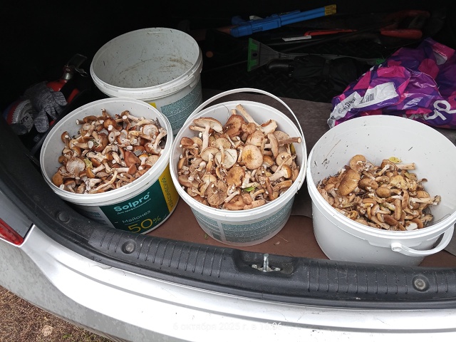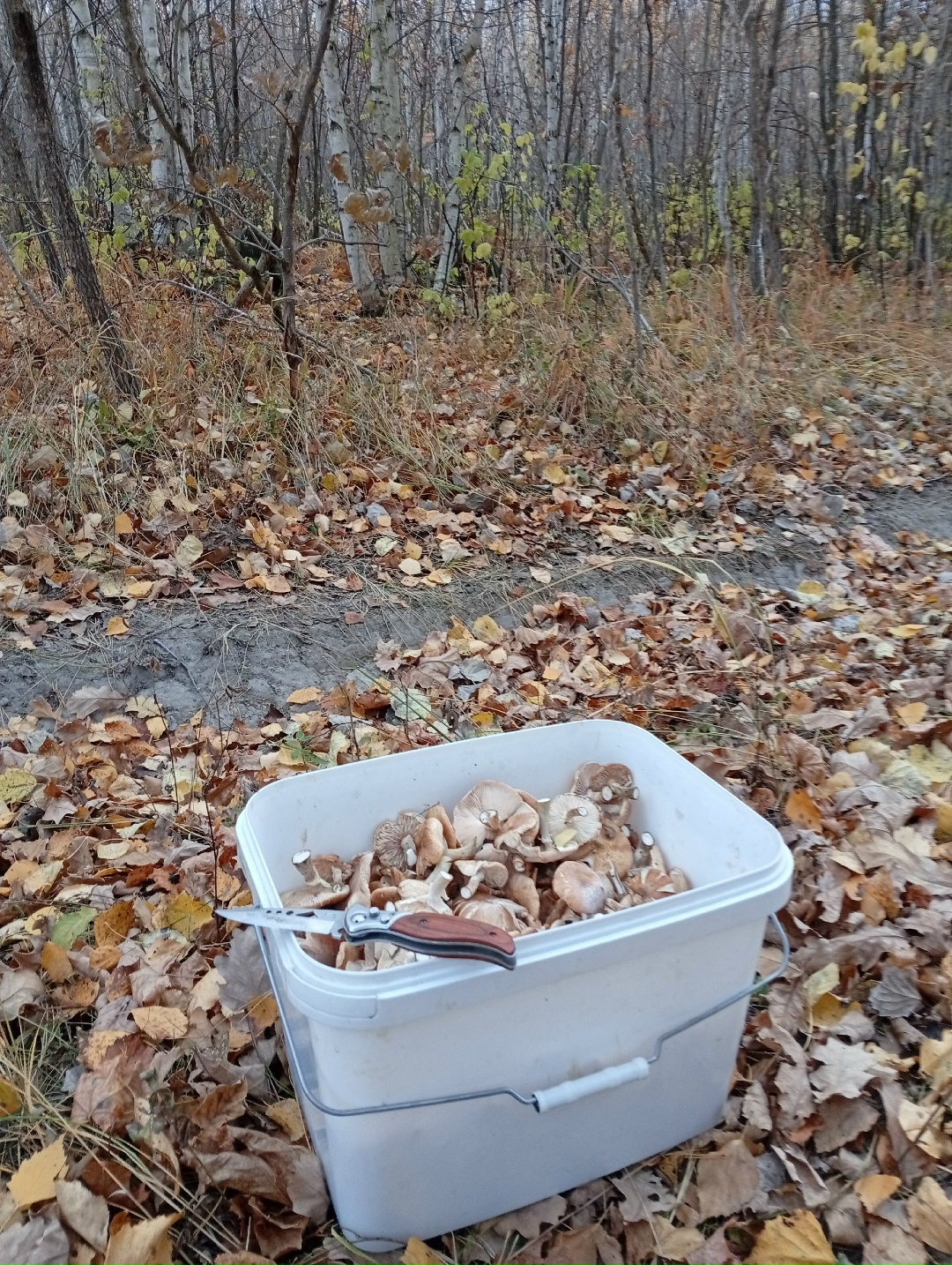 Опять остановка, опять просека, опять сбор опят пробежались, собрали опять по полтора ведёрка, пообщались с грибниками и снова а путь. Просек проехали много, нашли на них мало. Проехали поискали рыжики-но что то сухо для них, не нашли.