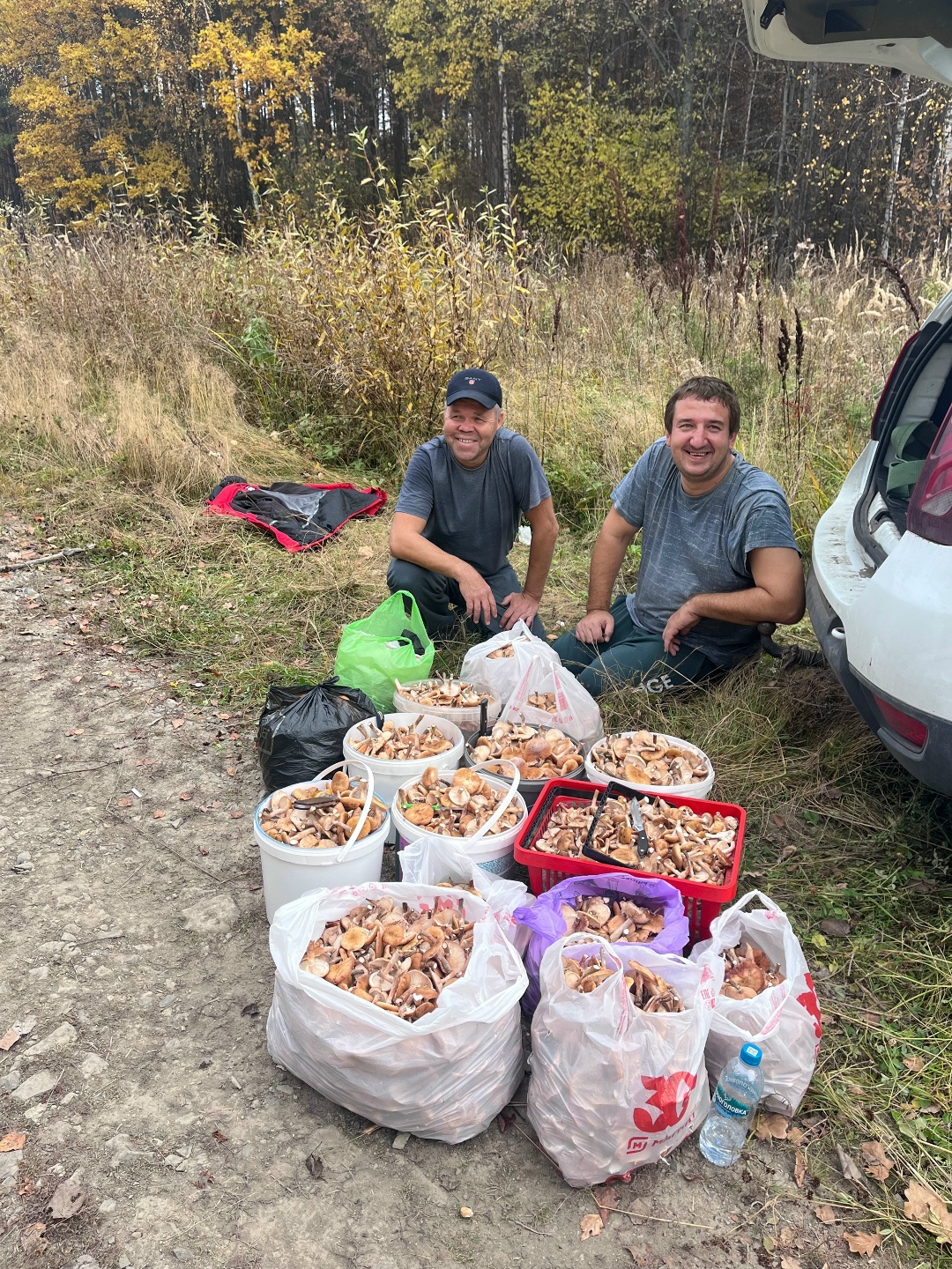 Спонтанно решаем заехать в местечко рядом с дорогой. Пробежались, собрали по полтора ведра и поехали дальше.