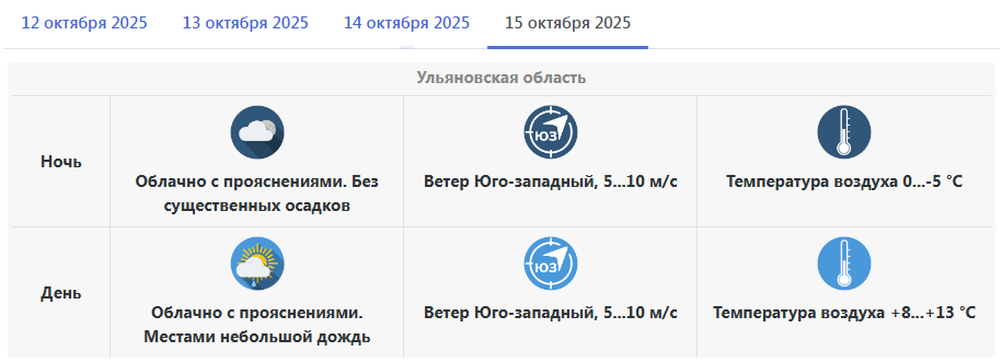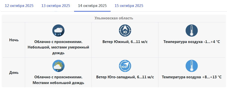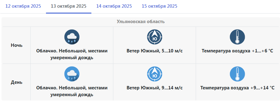 По прогнозу Гидрометцентра, в начале следующей рабочей недели в Ульяновской области с приближением атмосферных фронтов западного циклона атмосферное давление будет падать, ожидается облачная погода с небольшими дождями. В ночные часы температура воздуха в основном будет слабоположительной, днем не превысит +14°С.