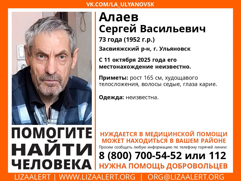 В Засвияжском районе Ульяновска пропал 73-летний Сергей Васильевич Алаев. По данным поисково-спасательного отряда «ЛизаАлерт», мужчина перестал выходить на связь 11 октября 2025 года, и с тех пор его местонахождение неизвестно.