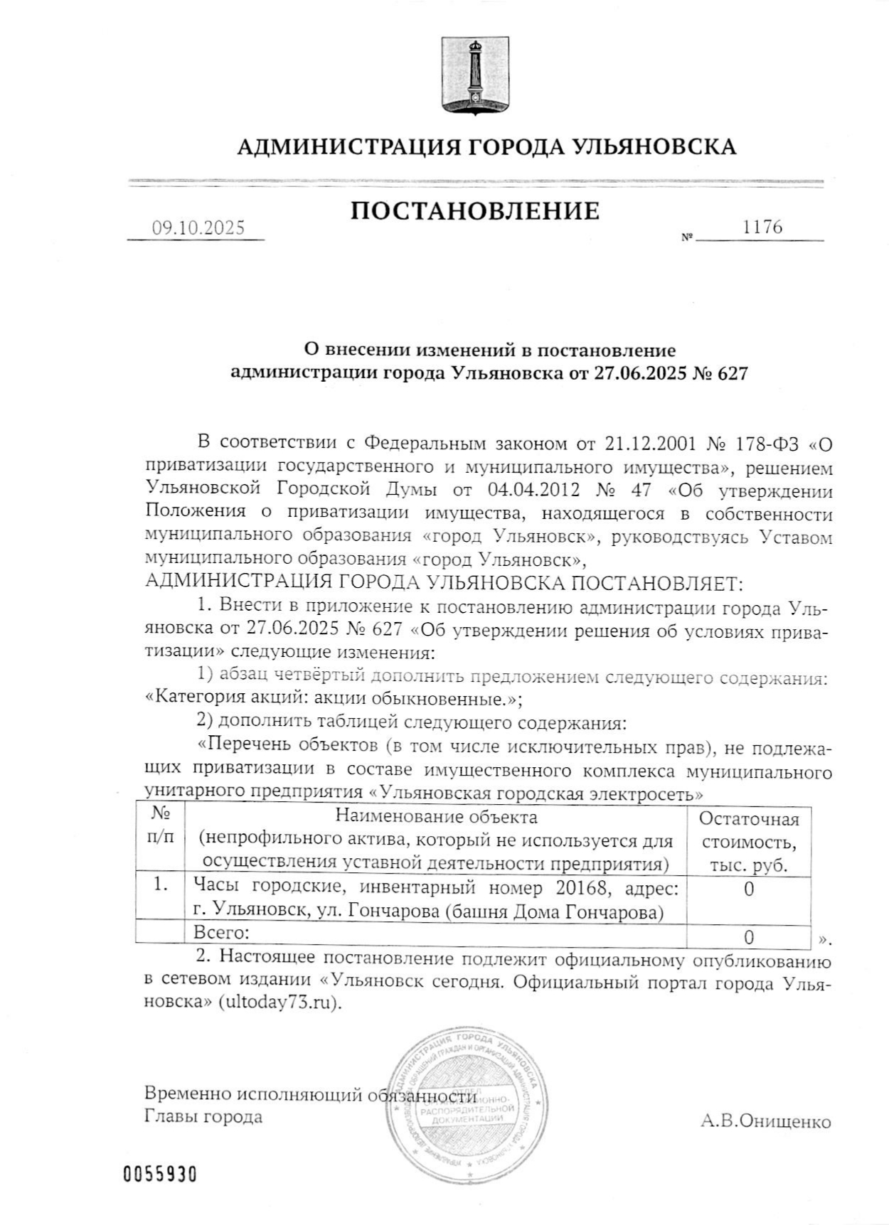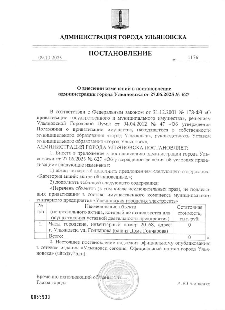Мэрия Ульяновска опубликовала постановление, согласно которому часть имущества МУП «Ульяновская городская электросеть» не будет подлежать приватизации. Речь идет о городских часах, расположенных на башне Дома Гончарова. Ранее Улпресса писала о том, что МУП «УльГЭС» решили приватизировать – такое распоряжение в конце июня подписал мэр Ульяновска Александр Болдакин. МУП сделали акционерным обществом. Сообщение о реорганизации в форме преобразования было опубликовано на Федресурсе 3 июля 2025 гда. Согласно выписке из ЕГРЮЛ, единственным участником МУП «Ульяновская городская электросеть» является Управление муниципальной собственностью администрации города Ульяновска. УльГЭС – одна из 14 сетевых компаний, работающих в Ульяновской области. В последние два года предприятие переживает не лучшие времена. 2024 год финансовые показатели МУПа были такими: выручка выросла до 1,3 млрд рублей (+12%), а чистая прибыль резко упала до минус 351,8 млн рублей (- 664%). ![]() |