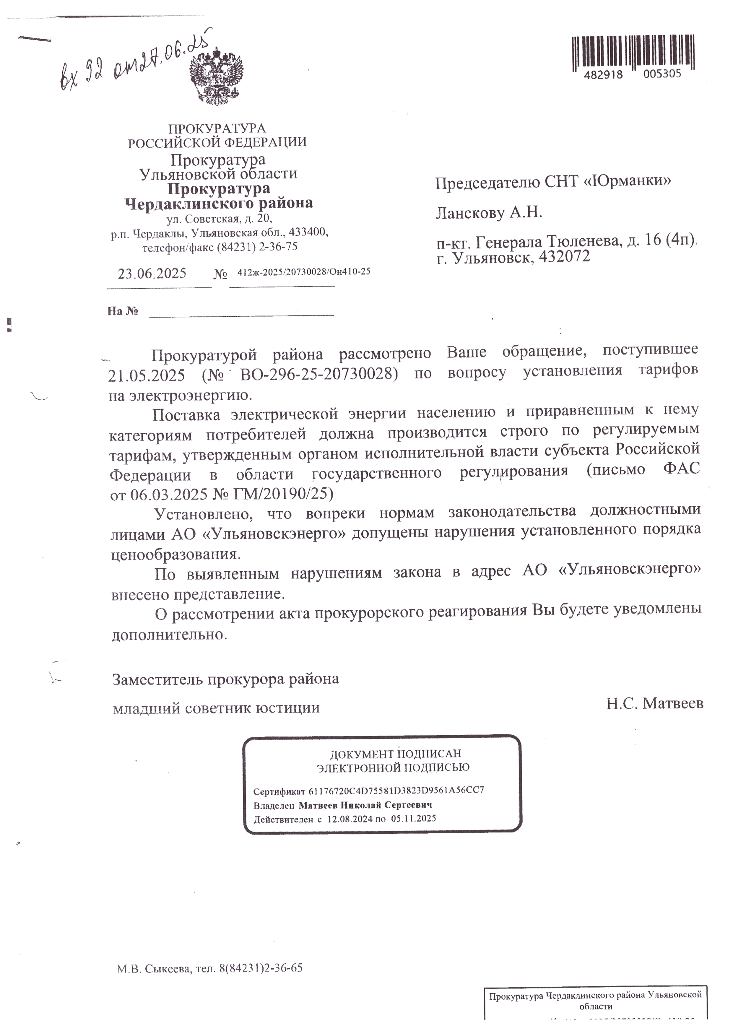 В Ульяновской области завершается дачный сезон, но садоводческая борьба продолжается. Правда, не за урожай, а за электроэнергию. Точнее, ее справедливую и законную оплату. С этого года части садоводов региона энергетики начали выставлять повышенные счета — по городскому, а не сельскому тарифу. Вопрос пытались решить областное агентство по тарифам, прокуратура, депутат Госдумы и, наконец, ФАС России. Разбираемся, к чему пришли на данный момент. Еще в июне прокуратура Чердаклинского района сообщила председателю СНТ «Юрманки», что, по ее мнению, «Ульяновскэнерго» «допущены нарушения установленного порядка ценообразования». Не заметить подтвержденные тогда прокуратурой «нарушения» садоводы не могли: ведь с начала дачного сезона за электричество с них стали брать как с городских жителей — по 4,93 рубля за килоВатт, хотя ранее расчеты велись по «сельскому тарифу». А это 3,45 рубля. Более того, с июля тарифы выросли — и стоимость электроэнергии для части садоводов региона поднялась уже до 5,55 рубля. Причем счета как у городских были только у тех членов СНТ, которые платили напрямую поставщику электроэнергии, а не делали это через садовое товарищество. Закрыть глаза на такую разницу не смогли и в областном агентстве по регулированию тарифов: при утверждении приказа о стоимости электроэнергии в 2025 году такой оплаты для дачников в него не закладывали. К разбирательствам после обращений садоводов подключились депутат Госдумы Алексей Куринный и региональное управление ФАС. Первые выводы тоже оказались в пользу дачников: агентство и управление ФАС сошлись в том, что энергетики неверно толкуют приказ об установлении тарифов. В июле агентства вынесло «Ульяновскэнерго» предписание об устранении нарушений. В том числе чиновники потребовали от энергетиков провести перерасчет садоводам. Но выполнять это требование энергетики не спешат. Предписание агентства обжалуется в Арбитражном суде. Кроме того, помимо суда, «Ульяновскэнерго» обратилось в Федеральную антимонопольную службу с заявлением «о рассмотрении разногласий, связанных с применением цен в области государственного регулирования». К середине сентября ФАС России вынесло свое решение. Неожиданно оно отличалось от позиции прокуратуры: московские антимонопольщики решили, что приказ агентства по тарифам на электроэнергию был неверен. Его потребовали отменить и принять другой. 30 сентября вышел новый приказ №163. Накануне руководитель агентства Галина Добровольская консультировалась в ФАС России. После подписания Галина Добровольская объяснила «Улпрессе», чем новый приказ отличается от прежнего и какие последствия он будет иметь для садоводов. Форма приказа №163, подчеркивают в агентстве по тарифам, соответствует требованиям ФАС России. В частности, в документе есть обязательные строки для разных категорий потребителей электроэнергии: 1-ая: эти тарифы применяются в случае заключения договора энергоснабжения с потребителями электрической энергии в границах городских населённых пунктов в жилых и (или) садовых домах, не оборудованных стационарными электроплитами и (или) электроотопительными установкам, и если строение не является жилым домом в границах сельских населённых пунктов. Это и есть так называемый «городской» тариф в 4,93 рубля. Следующие строки — со 2-ой до 8-ой по
