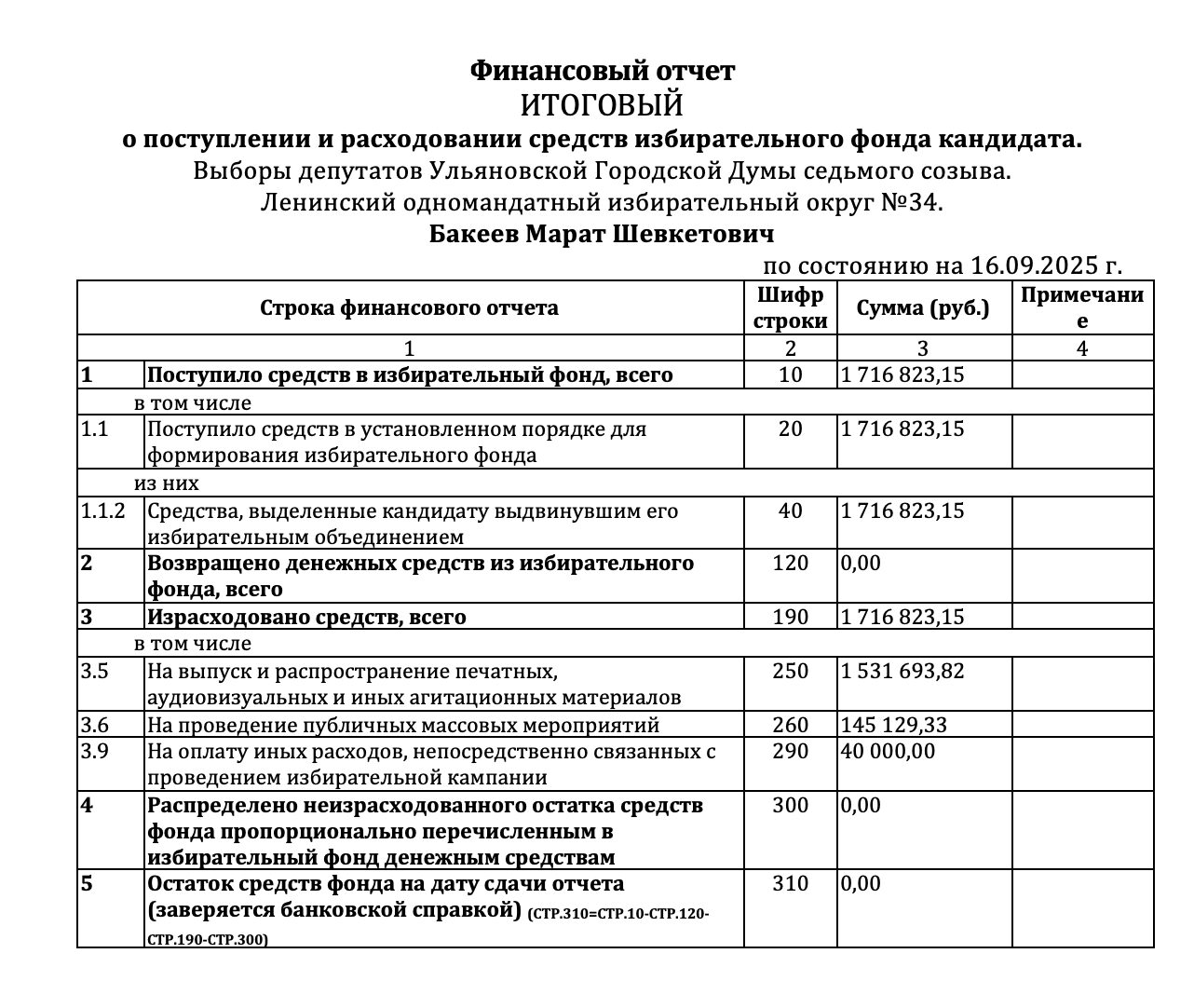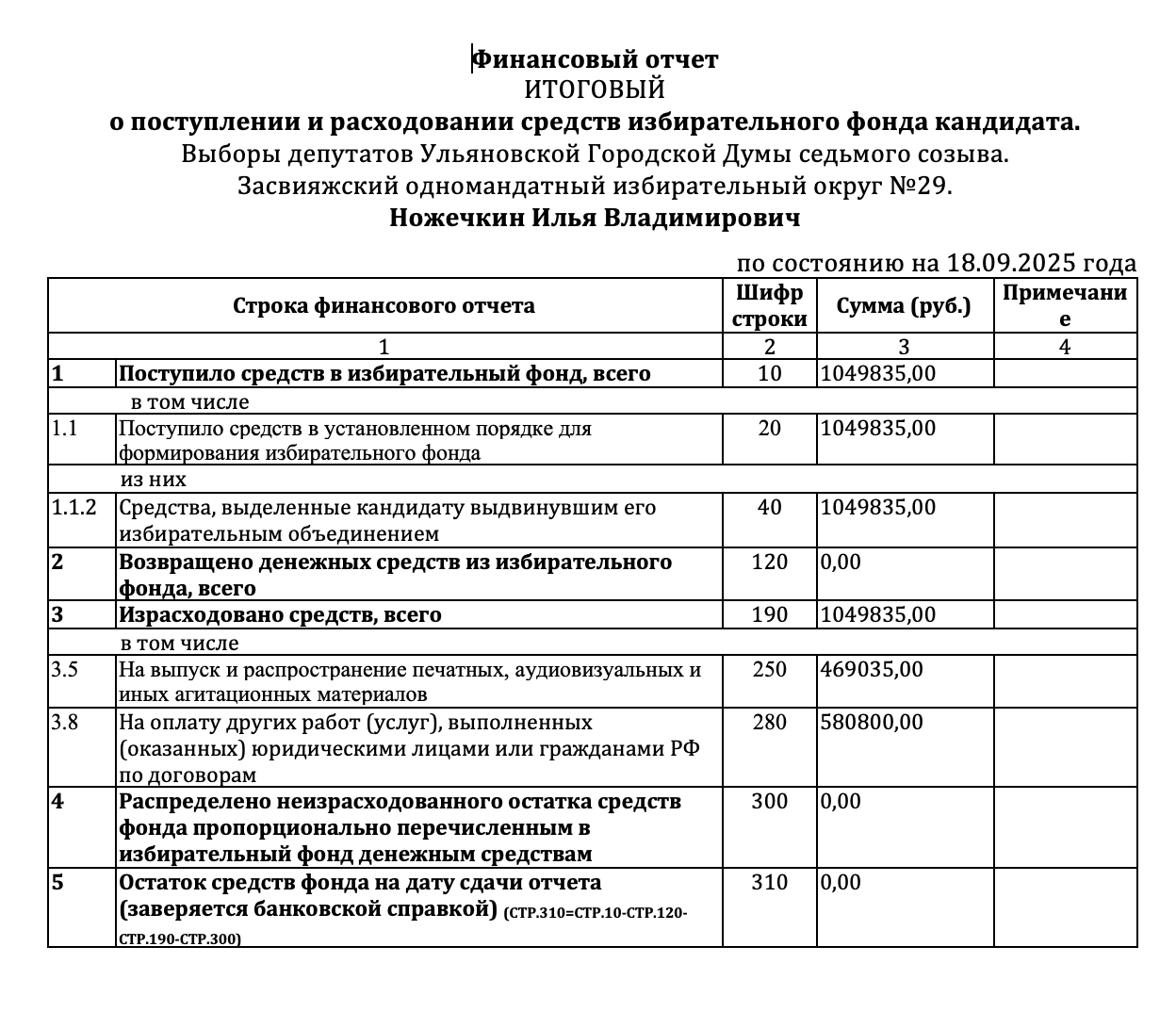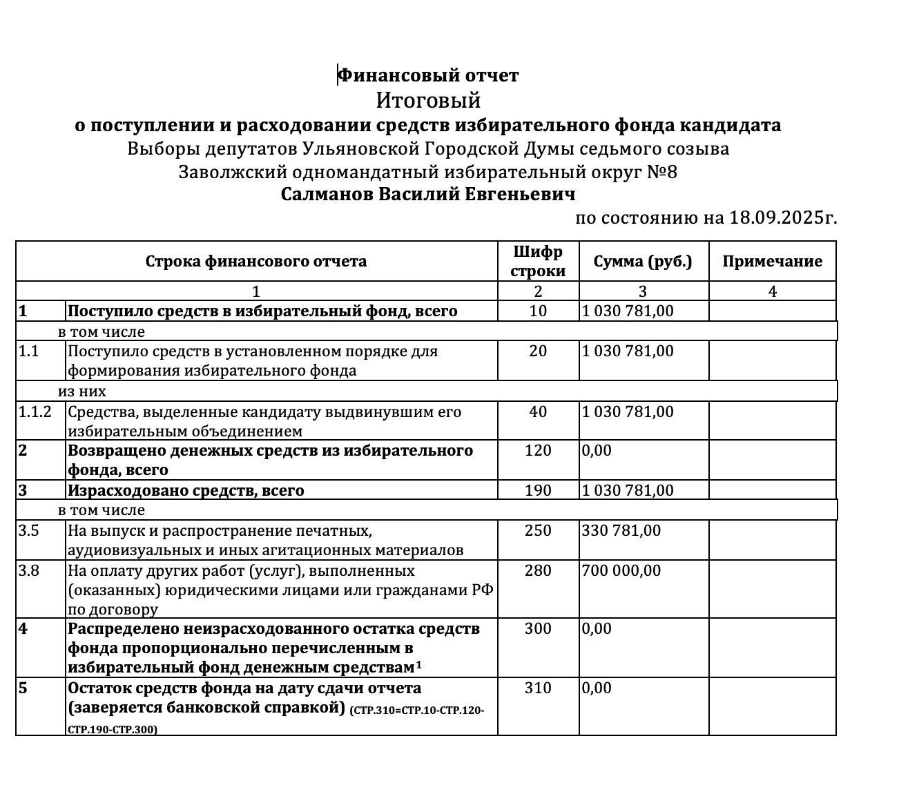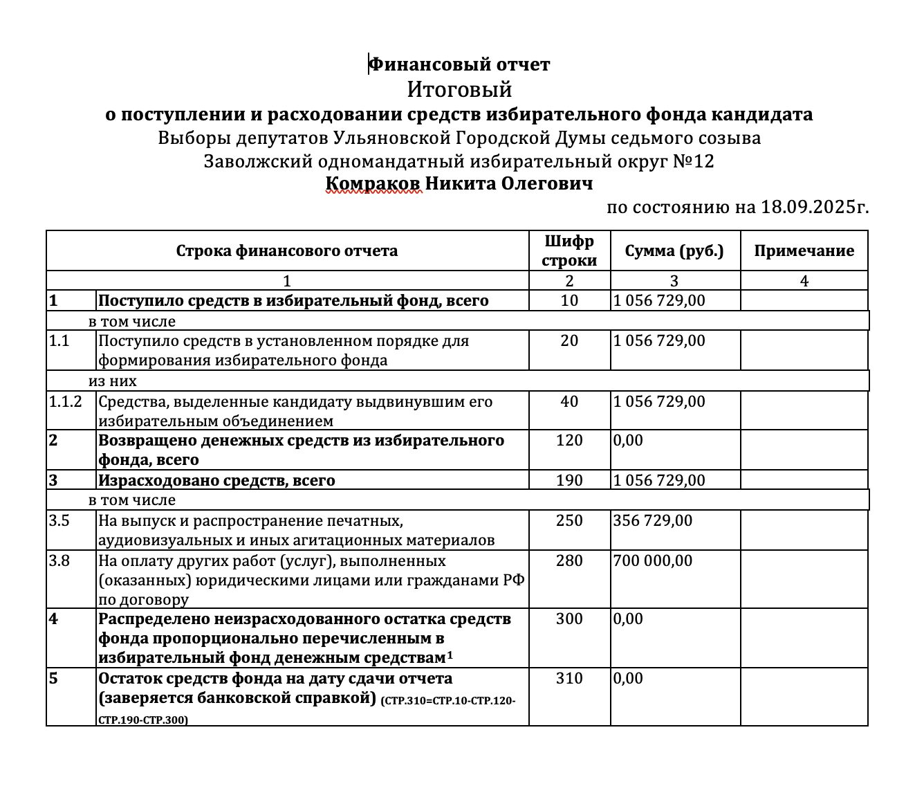 Избирком Ульяновской области опубликовал финансовые отчеты о расходах кандидатов в Гордуму Ульяновска, которые выиграли на выборах, на избирательную кампанию. Суммарные расходы 40 городских парламентариев составили около 25 миллионов рублей. Больше всех – почти 1,8 миллионов рублей – на свою кампанию потратил кандидат от «Новых людей» Марат Аряпов (округ №15). 1,7 млн рублей направил член партии ЛДПР Марат Бакеев (округ №34). Чуть более миллиона рублей потратили единоросы Илья Ножечкин (округ №29), Никита Комраков (округ №12) и Василий Салманов (округ №8). Итоговый финотчет Марата Бакеева Итоговый финотчет Ильи Ножечкина Итоговый финотчет Никиты Комракова Итоговый финотчет Василия Салманова
