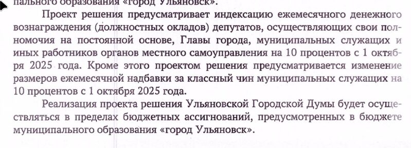 Опубликован проект решения Гордумы Ульяновска о повышении окладов для муниципальных служащих и других категорий городских управленцев. В документе речь идет о повышении с 1 октября на 10 процентов должностных окладов главы города, работающих на зарплате депутатов, муниципальных служащих и работников иных органов местного самоуправления. Кроме того, на 10 процентов должна вырасти ежемесячная надбавка за классный чин для муниципальных служащих. В прошлом году аналогичное повышение проводилось на 15 процентов. Как отмечается в пояснительной записке, средства на рост зарплат чиновников и депутатов уже заложены в городском бюджете.