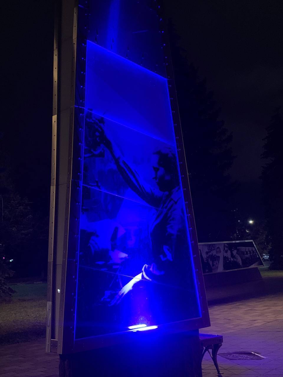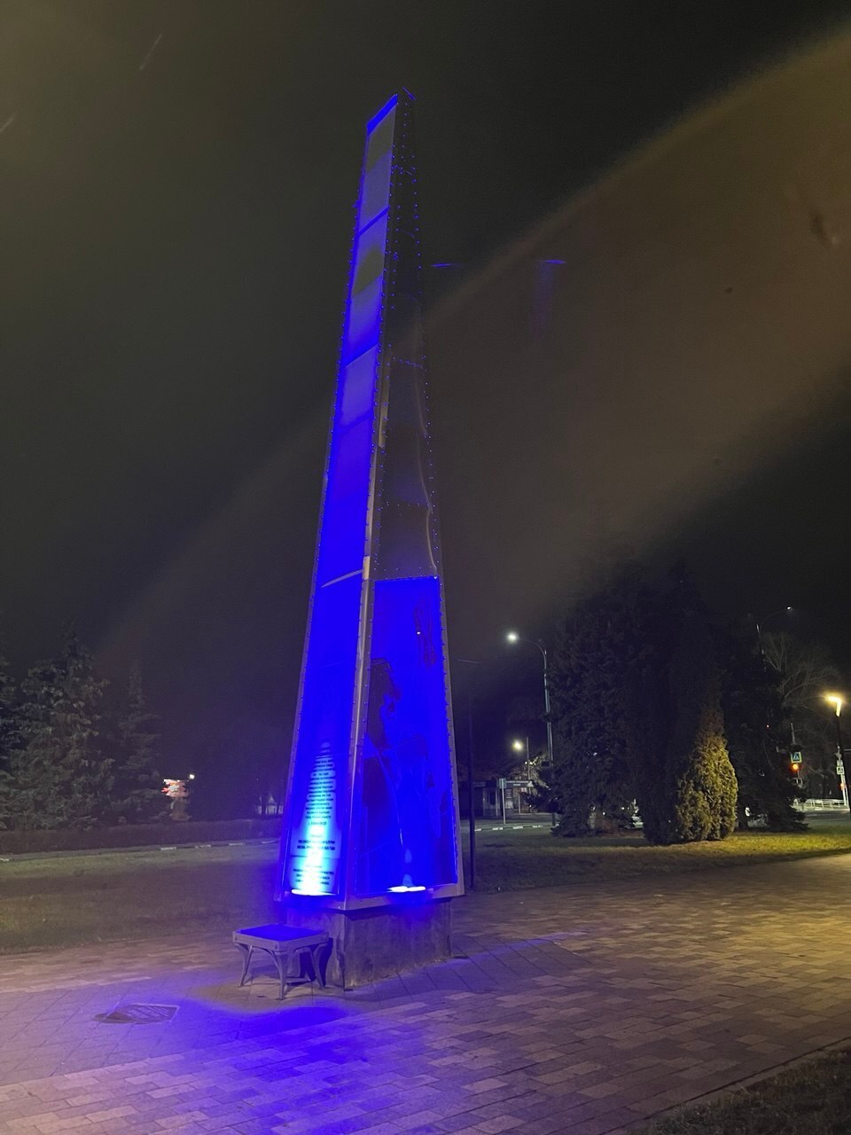 По информации профильного учреждения, новая синяя подсветка установлена по трем сторонам стелы и подсвечивает нанесенные на неё изображения.