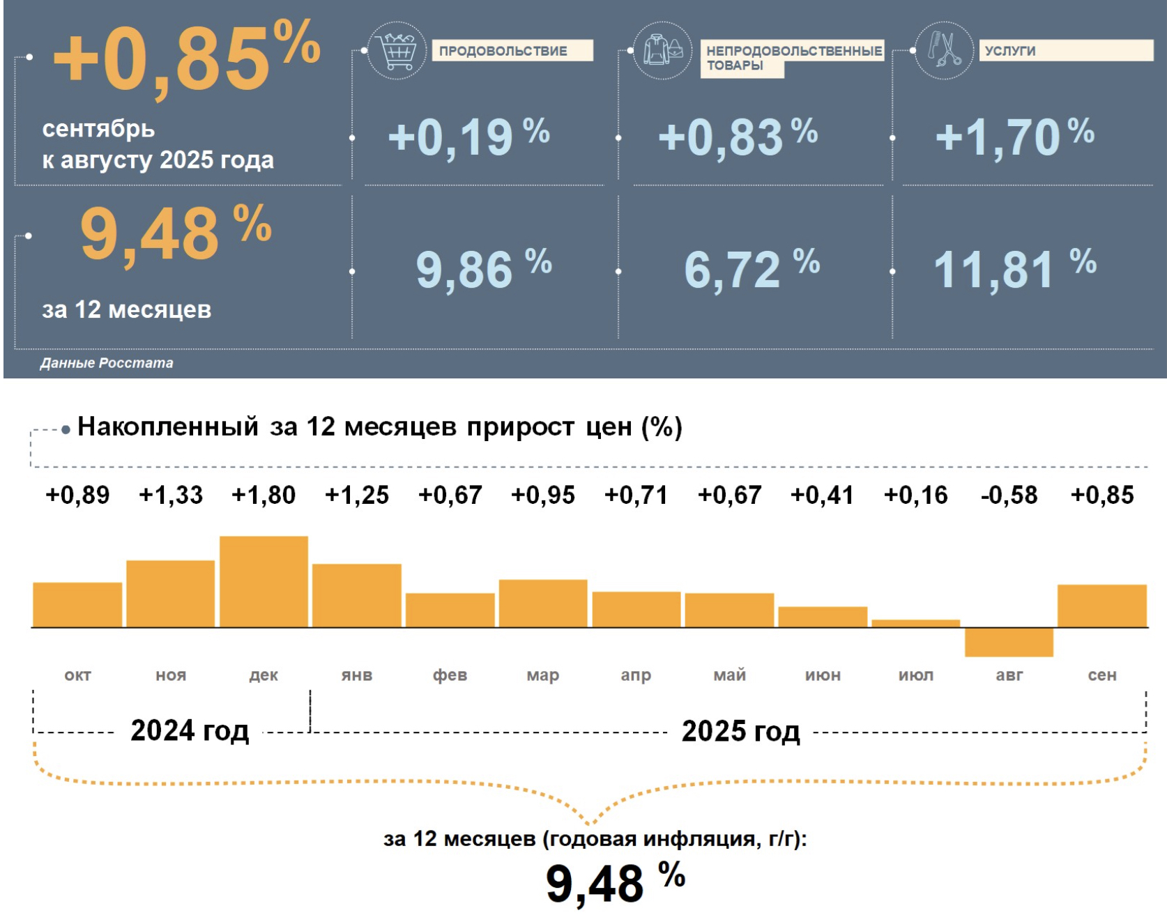В сентябре 2025 года цены в Ульяновской области выросли на 0,85% по сравнению с августом, а годовая инфляция достигла 9,48%. Это выше, чем в среднем по России (7,98%) и по Приволжскому федеральному округу (8,84%). Такие данные приводятся в исследовании Росстата и Банка России.