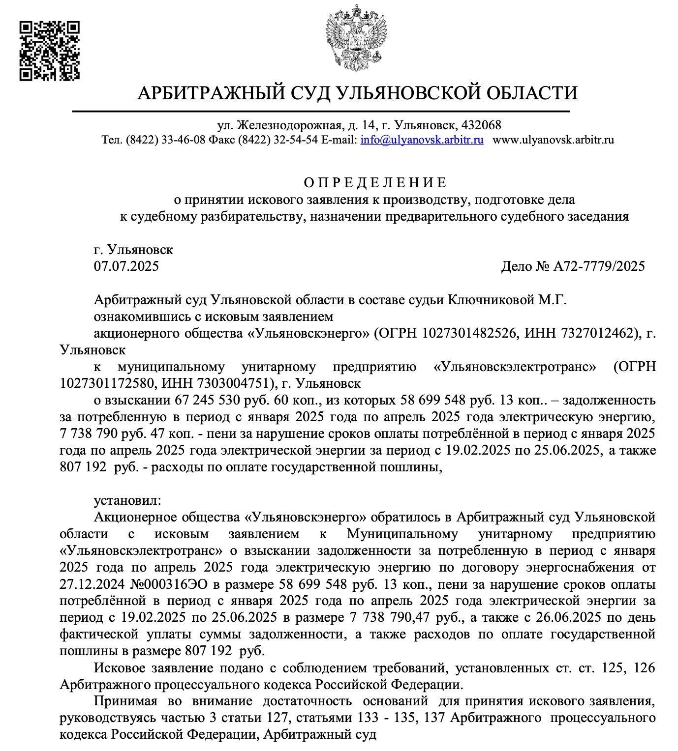 Вчера в арбитражном суде завершилось дело по иску АО «Ульяновскэнерго» к МУП «Ульяновскэлектротранс». УЭТ должен выплатить энергетикам почти 67 млн рублей долга за электроэнергию. В мэрии Ульяновска пояснили, что город предусмотрит средства на погашение этой задолженности. «Ульяновскэлектротранс» пока так и остается хроническим должником со сложной финансовой ситуацией. Иск от энергетиков касался задолженности УЭТ с января по апрель 2025 года. По договору энергоснабжения предприятие накопило неоплаченные 58,7 млн рублей, плюс пени – 7,7 млн, и то, что набежало с 26 апреля по день фактической уплаты суммы задолженности. Никакой борьбы при рассмотрении дела в арбитраже не было, судья иск «Ульяновскэнерго» удовлетворил. На вопрос, что будет дальше, заммэра Ульяновска Александр Ермаков ответил, что «город будет предусматривать денежные средства на субсидии для погашения кредиторской задолженности». И уточнил что «в текущем году повышения тарифа на проезд в электротранспорте не будет». Сложная финансовая ситуация в «Ульяновскэлектротрансе» сложилась давно. Впервые конкретные цифры были обнародованы в феврале нынешнего года. Тогда экс-директор МУПа Александр Шерстнев заявил, что задолженность перед кредиторами составляла более 187 млн рублей, счета в банках были заблокированы службой судебных приставов и Федеральной налоговой службой, все расчеты приостановились. Чтобы предприятие работало нормально, нужно было закрыть кредиторскую задолженность в сумме не менее 200 млн рублей. Этим летом пошли слухи, что УЭТ может рассчитаться с энергетиками имуществом – якобы МУП переедет из здания на Гончарова и из Северного депо на Московское шоссе. Городские власти тогда не подтвердили эту информацию. Спустя месяц «Ульяновскэлектротранс» взял кредит в размере 49,9 млн рублей. Стоимость займа – чуть более 11 млн, расплатиться предприятие должно до 2026 года. Кредитные средства ушли на погашение долгов перед основным поставщиком – «Ульяновскэнерго». На всю сумму их не хватило – по данным на 26 августа, общая задолженность МУПа составляла 208,3 млн рублей. В том числе, перед Ульяновскэнерго – 141,3 млн (104,5 млн – основной долг и 36,8 млн – пени). А теперь к ней прибавились еще и просуженные 67 млн рублей. Сейчас, согласно открытым данным, счета у УЭТ не заблокированы. Но в арбитраже есть несколько дел от разных компаний – поставщиков товаров и услуг. Например, чебоксарскому ОАО «Магистраль» предприятие задолжало чуть более 1 млн рублей, ООО «Уральский подшипник» – 1,1 млн, сервисному центру «Транстелематика» – 434 тысячи. Пусть не десятки миллионов, но тем не менее. «Ульяновскэлектротранс» трижды подходил к грани банкротства. В августе 2018 года заявление в арбитраж подавало УФНС по Ульяновской области. В декабре того же года намерение обратиться в суд с заявлением о банкротстве подавало ООО «Деталь», а в феврале 2025-го – ООО «Металлинвест-Новосибирск». Все эти долги были погашены. Фото на главной – телеграм-канал УЭТ |