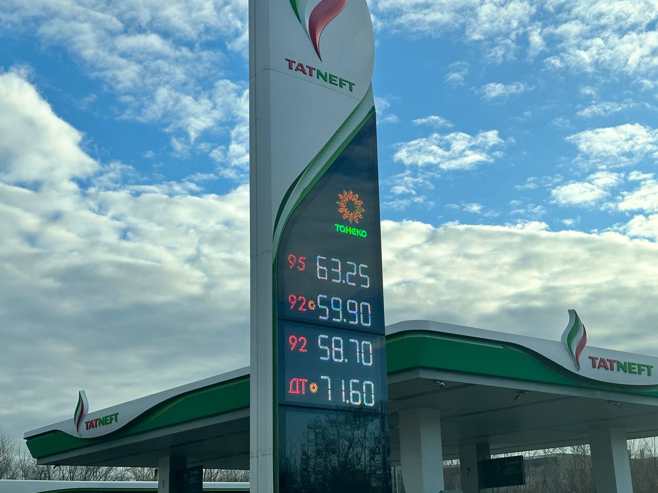 Татнефть: АИ-92 — 58,70 ₽, АИ-95 — 63,25 ₽, Дизель — 71,60 ₽.