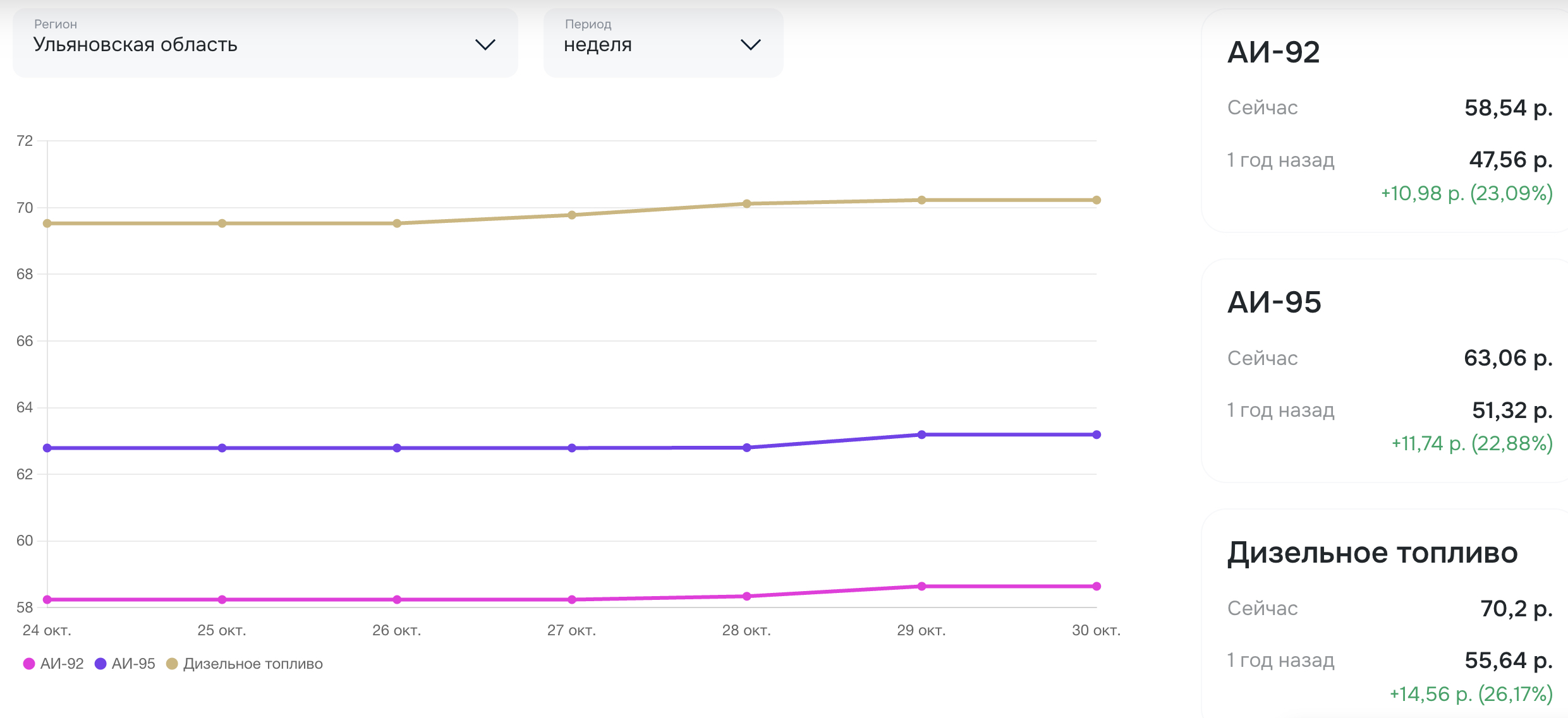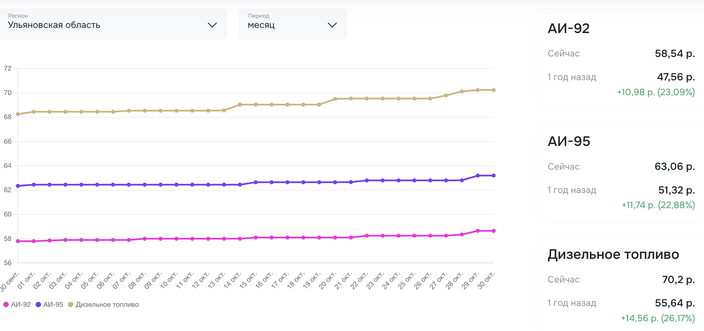 Согласно данным аналитического портала petrolplus.ru, только за последний месяц средняя цена на дизельное топливо в регионе выросла почти на 2 рубля, а на бензин — более чем на рубль. Годовая динамика еще более удручающая: с октября прошлого года АИ-92 подорожал на 23% (+11 рублей), АИ-95 — почти на 23% (+11,7 рубля), а дизель — на 26% (+14,5 рубля).