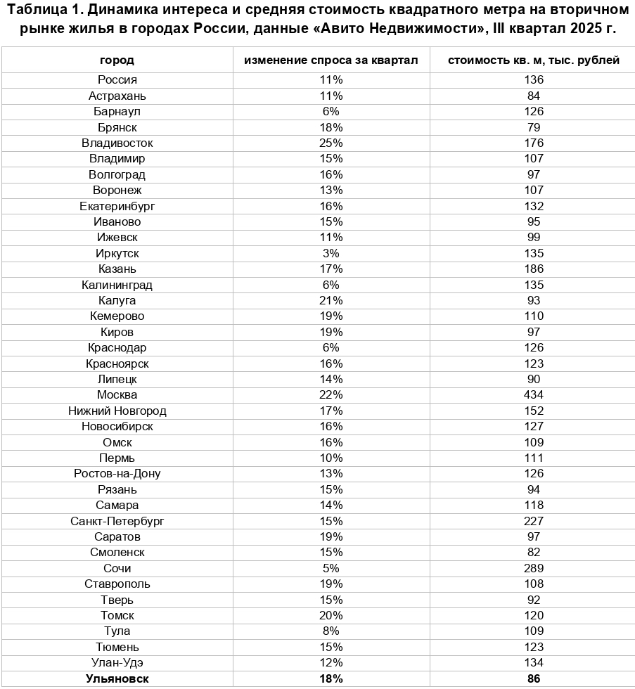 Несмотря на оживление, цены остаются на привлекательном уровне. Средняя стоимость квадратного метра на вторичном рынке Ульяновска составляет 86 тысяч рублей, что является одним из самых низких показателей среди исследованных городов России. Для сравнения, в Москве цена достигает 434 тысяч рублей за кв. м, а в Сочи — 289 тысяч.