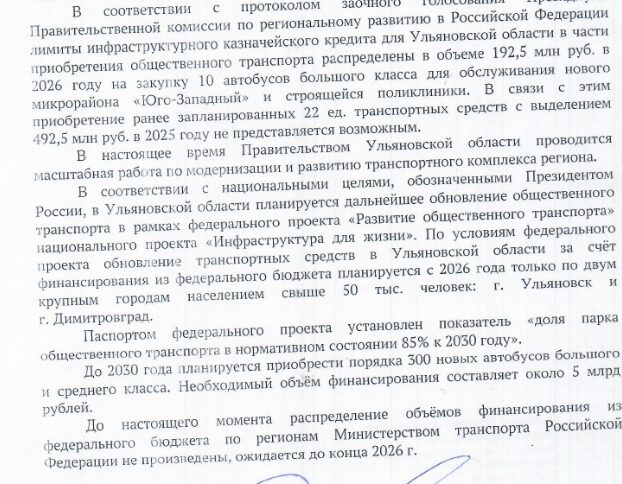 Но, как уточнил министр, комиссия правительства РФ по региональному развитию приняла решение распределить Ульяновской области 192,5 млн рублей из инфраструктурного казначейского кредита на закупку 10 автобусов большого класса. Закупка должна пройти уже в 2026 году. Автобусы будут закупать для обслуживания микрорайона «Юго-Западный» и строящейся поликлиники, уточнил министр.