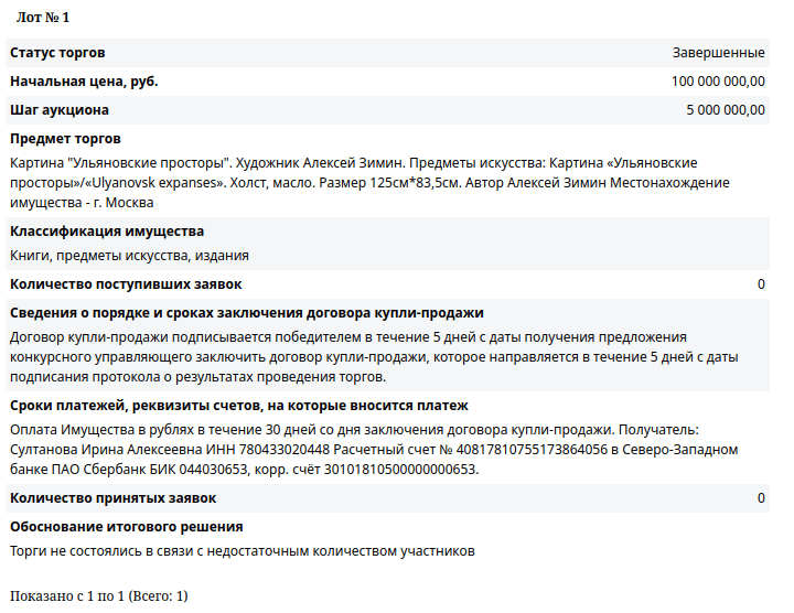 Работа Алексея Зимина, родившегося в Ульяновске и живущего в Москве, выставлена на торги за рекордную сумму — 4,8 млрд рублей. Полотно называется «Легкое блаженство», размер его — 120 на 100 см. Как указано на сайте «Торги России», выполнено полотно в стиле «тюббизм». Продается «Блаженство» в рамках банкротства жительницы Москвы Альбины Кузнецовой. Кузнецова является одним из учредителей жилищного накопительного кооператива «Наследие», который еще к концу 2023 года сработал в убыток. Решением Арбитражного суда Москвы от 10 февраля 2025 года в отношении Кузнецовой введена процедура реализации имущества гражданина. Причиной такого решения стало в том чисе невыполнение требования о передаче финансовому управляющему автомобиля Land Rover. На своем сайте Алексей рассказывает об изобретенном им тюббизме: