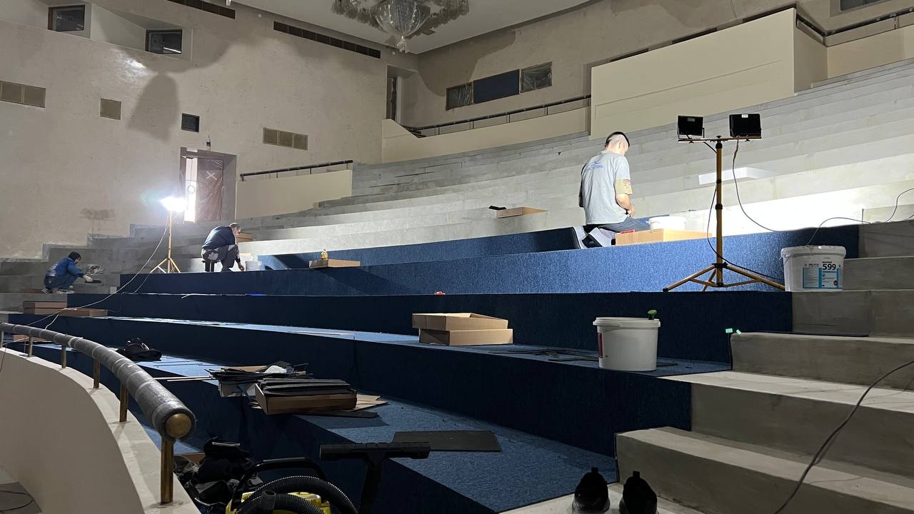 В зале уже полностью отреставрированы знаменитые люстры, потолки и стены. Сейчас рабочие укладывают ковролин, после чего приступят к монтажу новых концертных кресел.