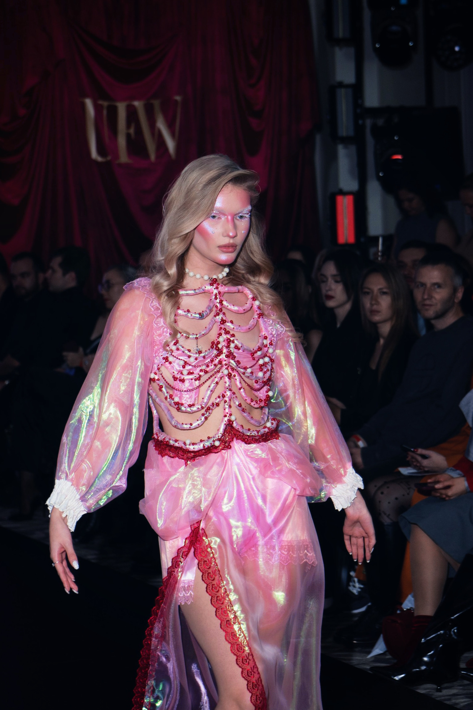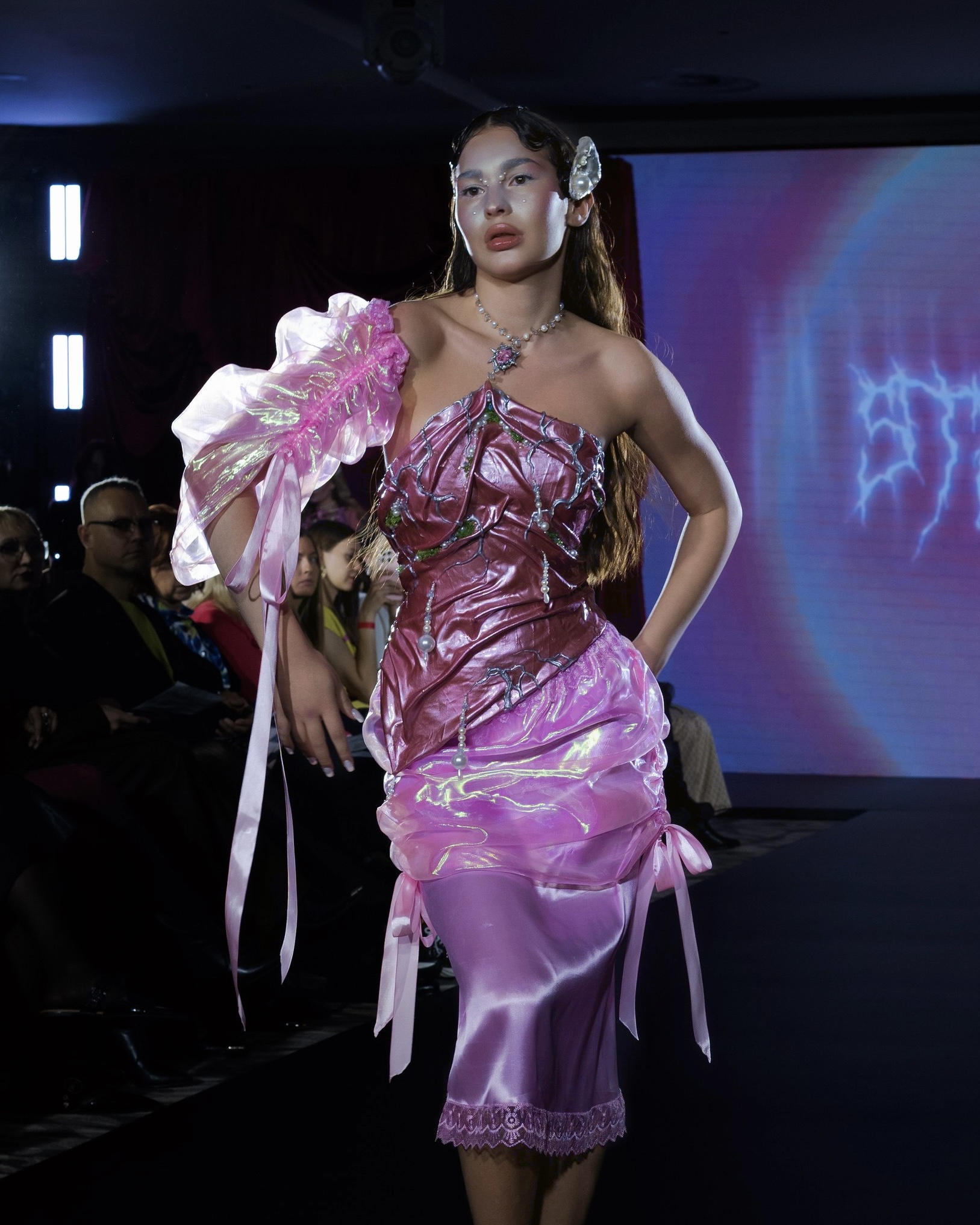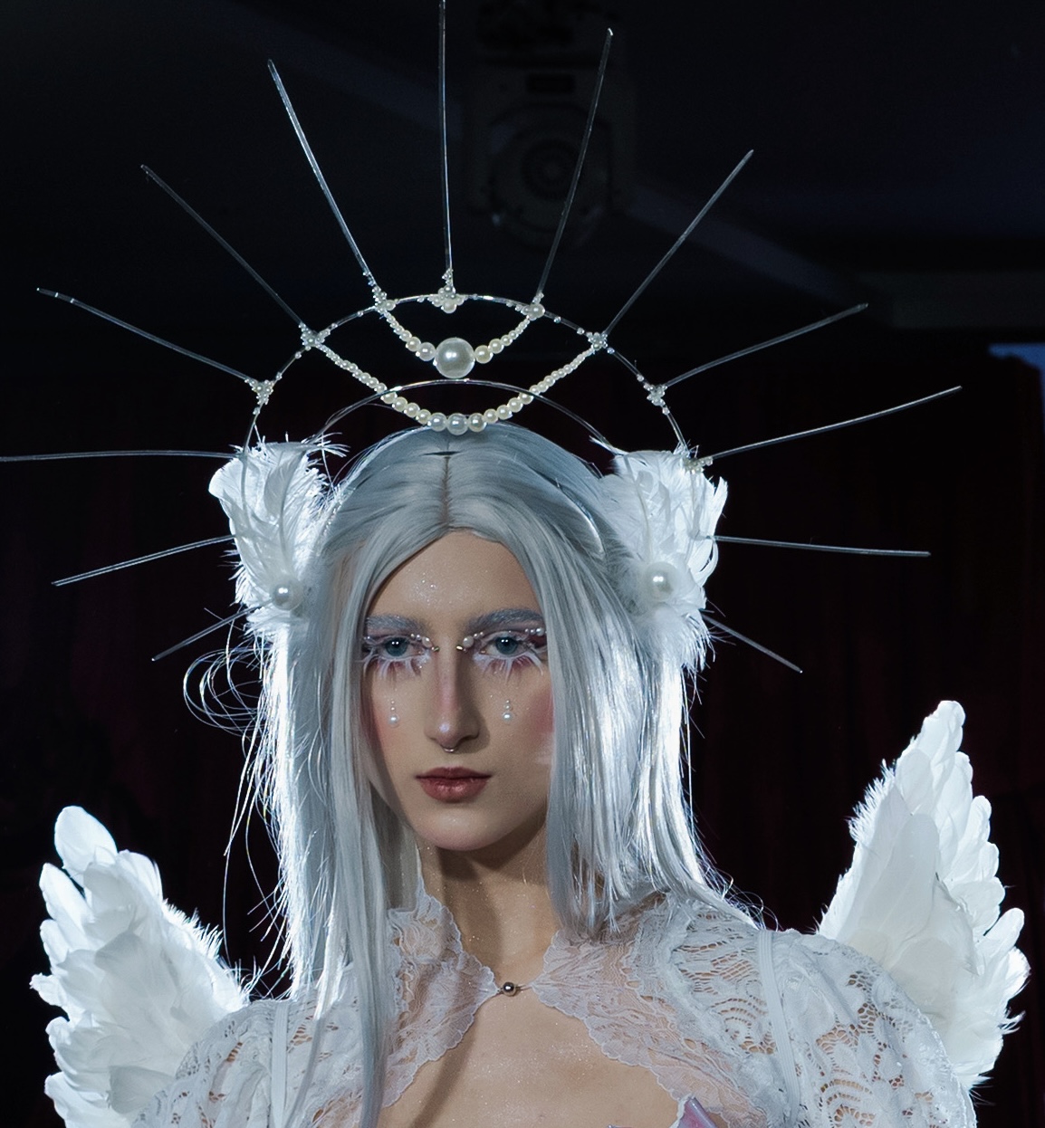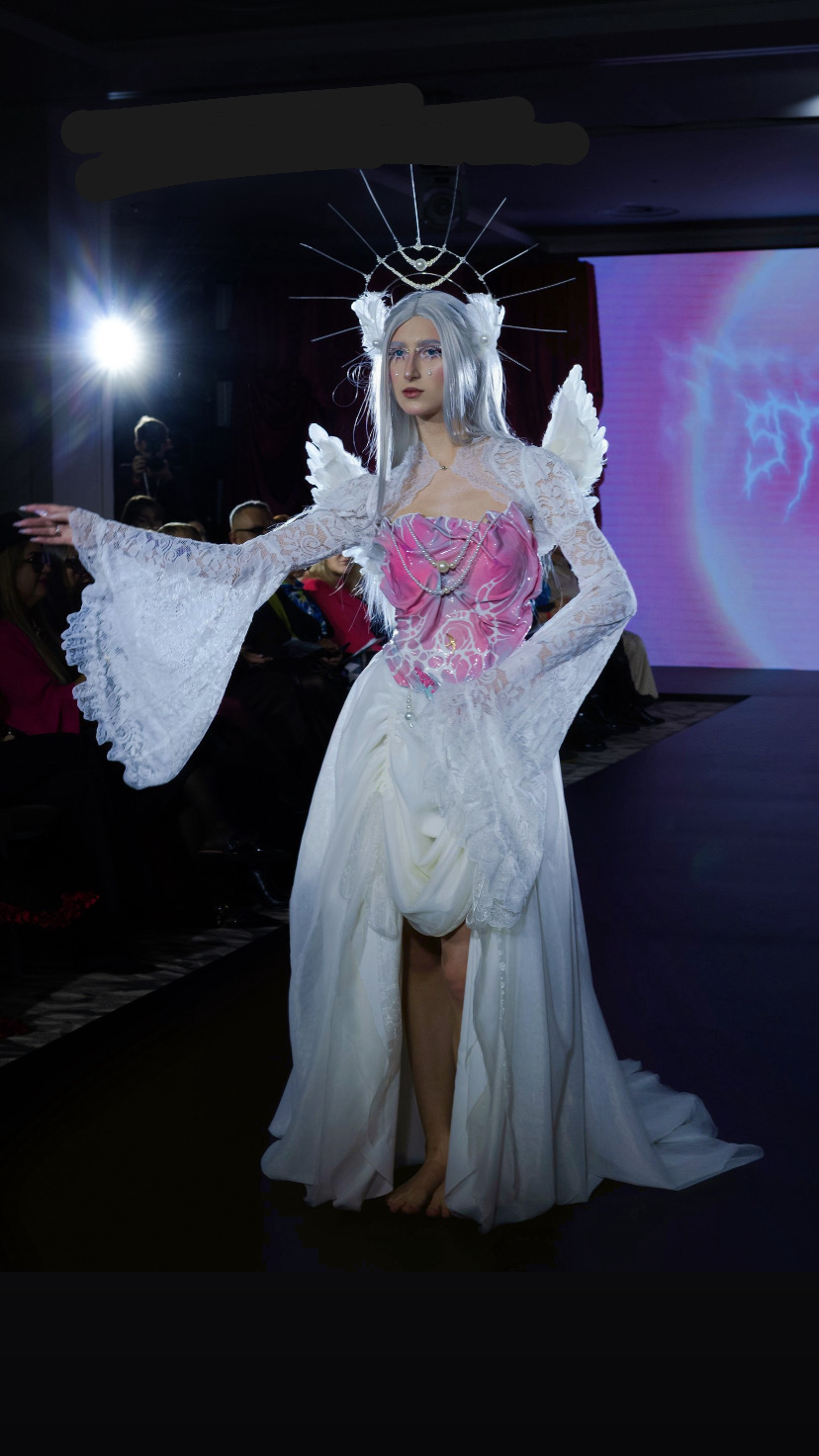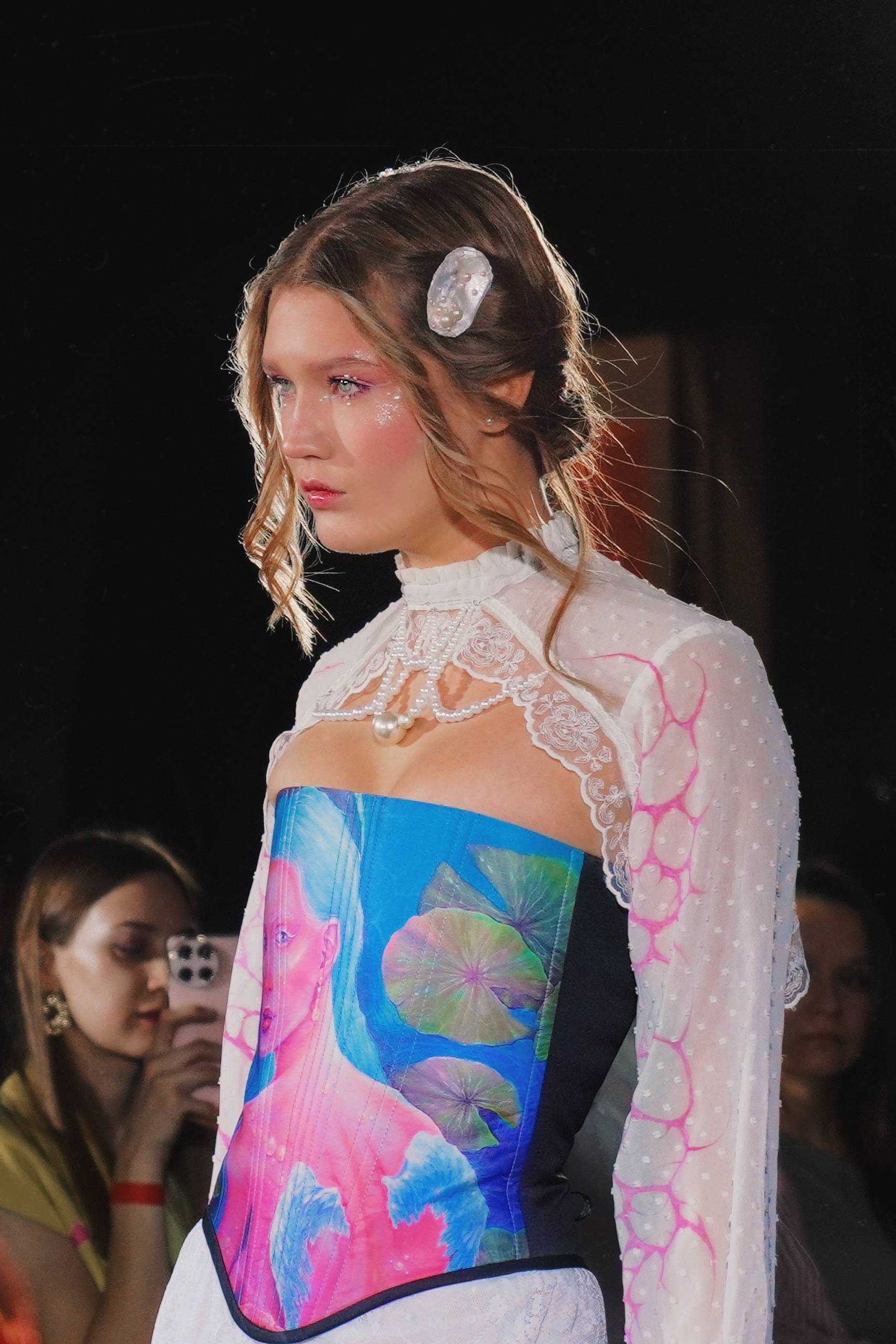 – Мой образ — это кульминация всей истории. На подиум я всегда выхожу не как дизайнер, а как лирический герой своих полотен и рассказчик. В этот раз образ отражал главную идею картины: женственную хрупкость, но с «бронёй» в виде фактурного корсета; свет, возрождение и силу. Он пропитан отсылками и метафорами. Основой стало моё кастомное свадебное платье как отражение финальной идеи, что любовь — самая большая сила на свете. Цельность образа завершила диадема-луна и зарождающиеся крылья как у той самой нимфы с картины.