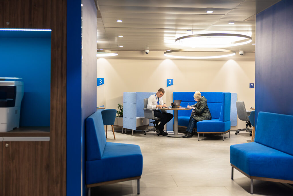 В отделении предусмотрены комфортные зоны обслуживания с мягкой мебелью и живыми растениями. Обсудить конфиденциальные вопросы можно в переговорной комнате. Для удобства посетителей организован доступ к бесплатной сети Wi-Fi, оборудована кофе-станция. В круглосуточной зоне работают три банкомата с поддержкой операций по QR-коду.