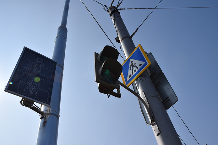 Ещё один новый светофорный объект с кнопкой вызова зелёного сигнала уже действует в районе остановки «Гарнизонный магазин». Он установлен на месте ранее нерегулируемого пешеходного перехода в рамках реализации нацпроекта «Инфраструктура для жизни».