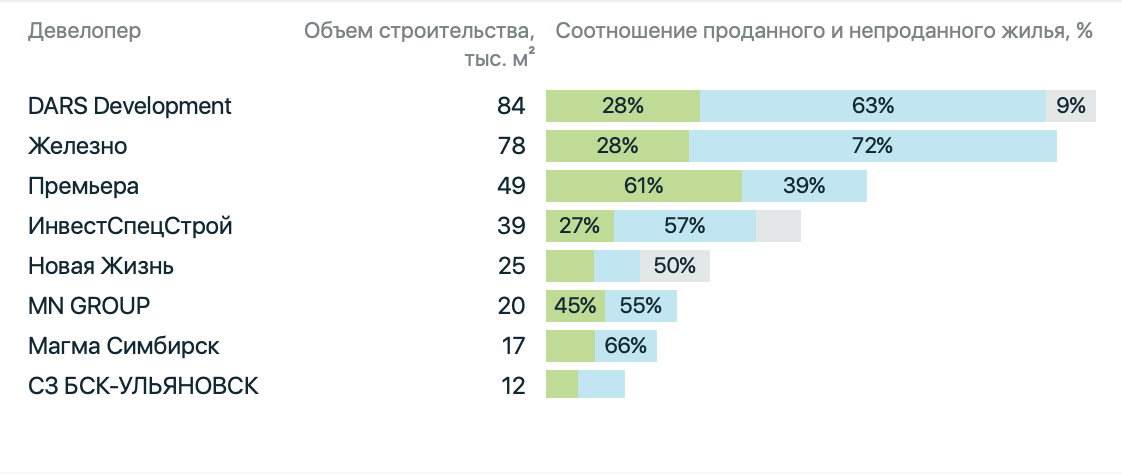 13% нераспроданных квартир сдается в регионе в этом годуСитуация с продажами у ключевых ульяновских девелоперов (зеленый – распродано, голубой – нераспродано, серый – продажи не открыты)Средняя стоимость квадратного метра в ульяновских новостройках за май-октябрь 2025 года выросла со 107 982 рублей до 111 135 рублей. При этом, по данным ЕИСЖС на 15 ноября, медианная стоимость строительства 1 кв.м. общей площади в Ульяновской области составила 56 тысяч рублей, а средняя – 40 тысяч. Как все это отразится на рынке недвижимости, ждать ли снижения цен, раз продажи «стоят»? По словам партнера агентства недвижимости «Этажи Ульяновск» Дмитрия Шахина, «перегруза» рынка новостроек риэлторы фактически не ощущают: