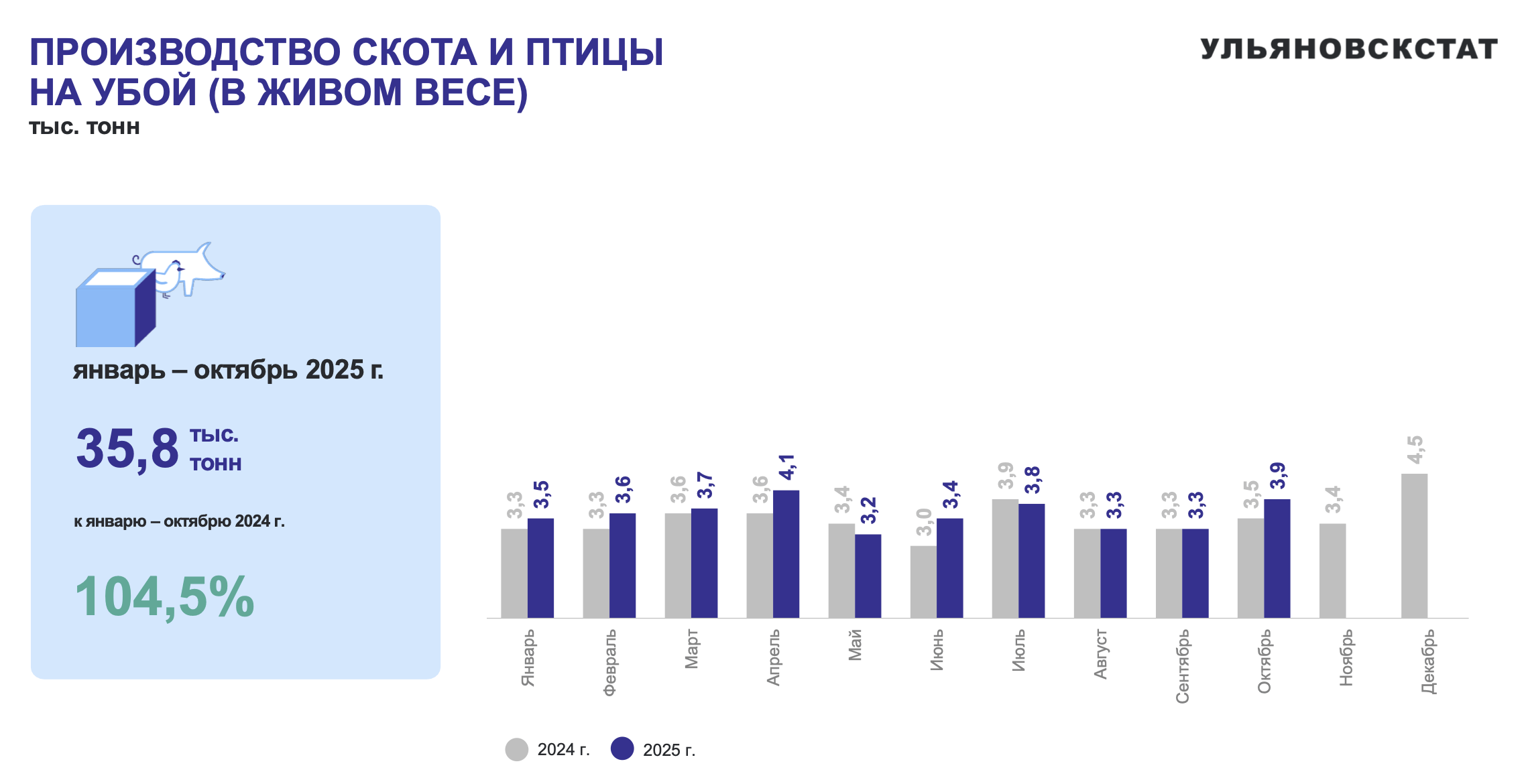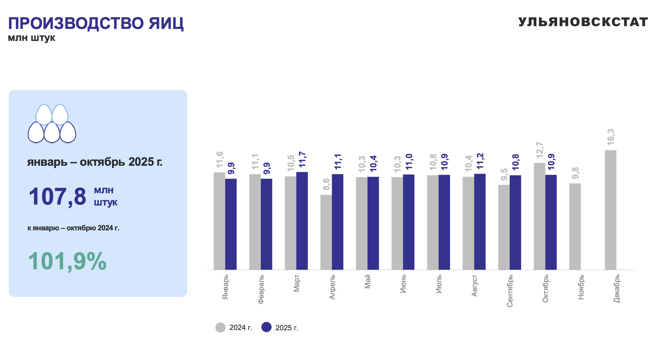 – По итогам 9 месяцев в хозяйствах всех категорий идет снижение производства молока, мяса, яиц. Сильно сократилось поголовье скота и птицы в хозяйствах населения. По данным на 1 октября, количество голов КРС упало, по сравнению с тем же периодом 2024 года, на 17,8%, свиней – на 29%, птицы – на 27%. Это привело к уменьшению объемов производства. Валовый надой молока снизился на 30%, производство яиц – на 27%, скота и птицы на убой – на 19%, – озвучил статистику глава Минсельхоза.