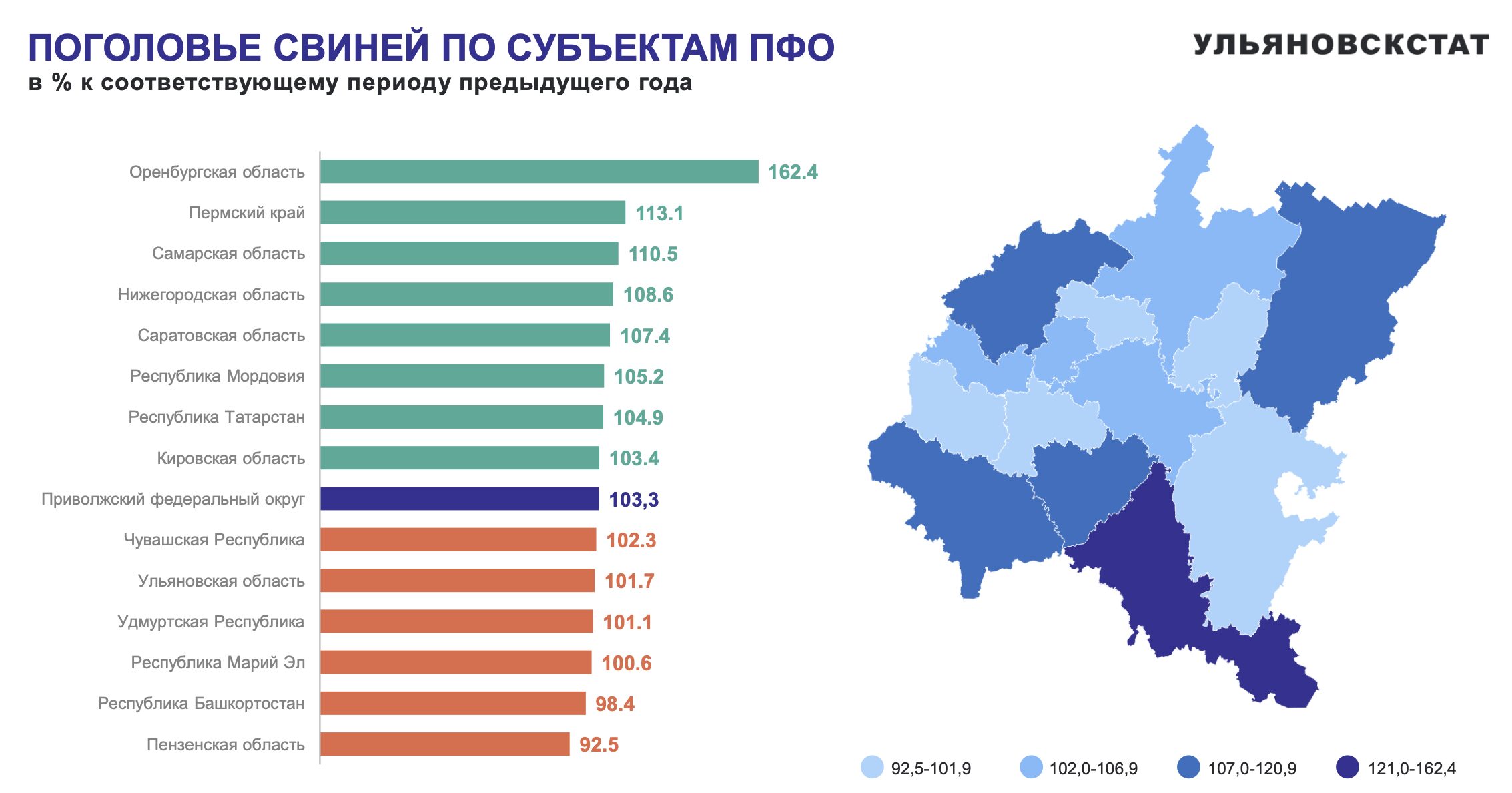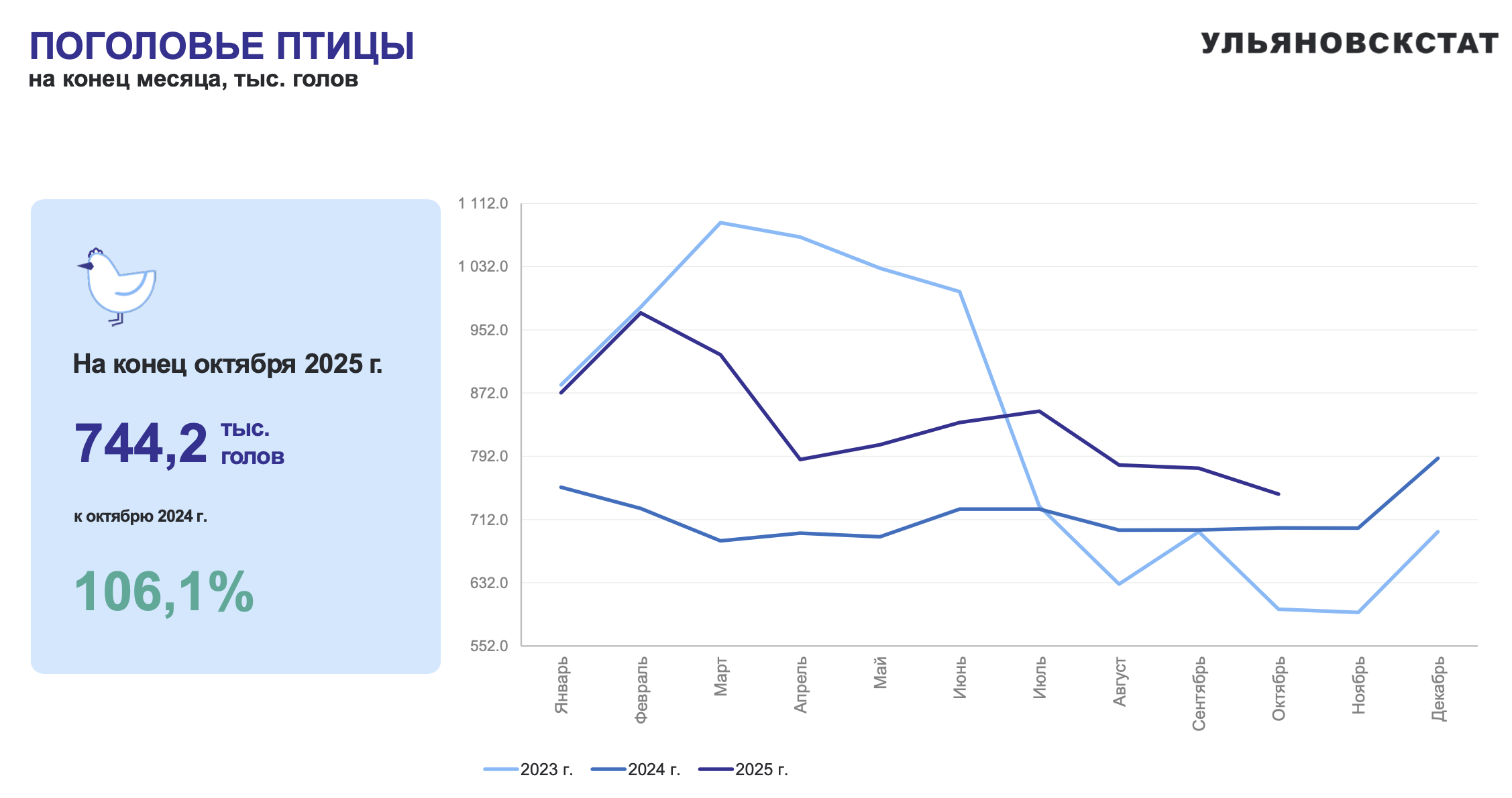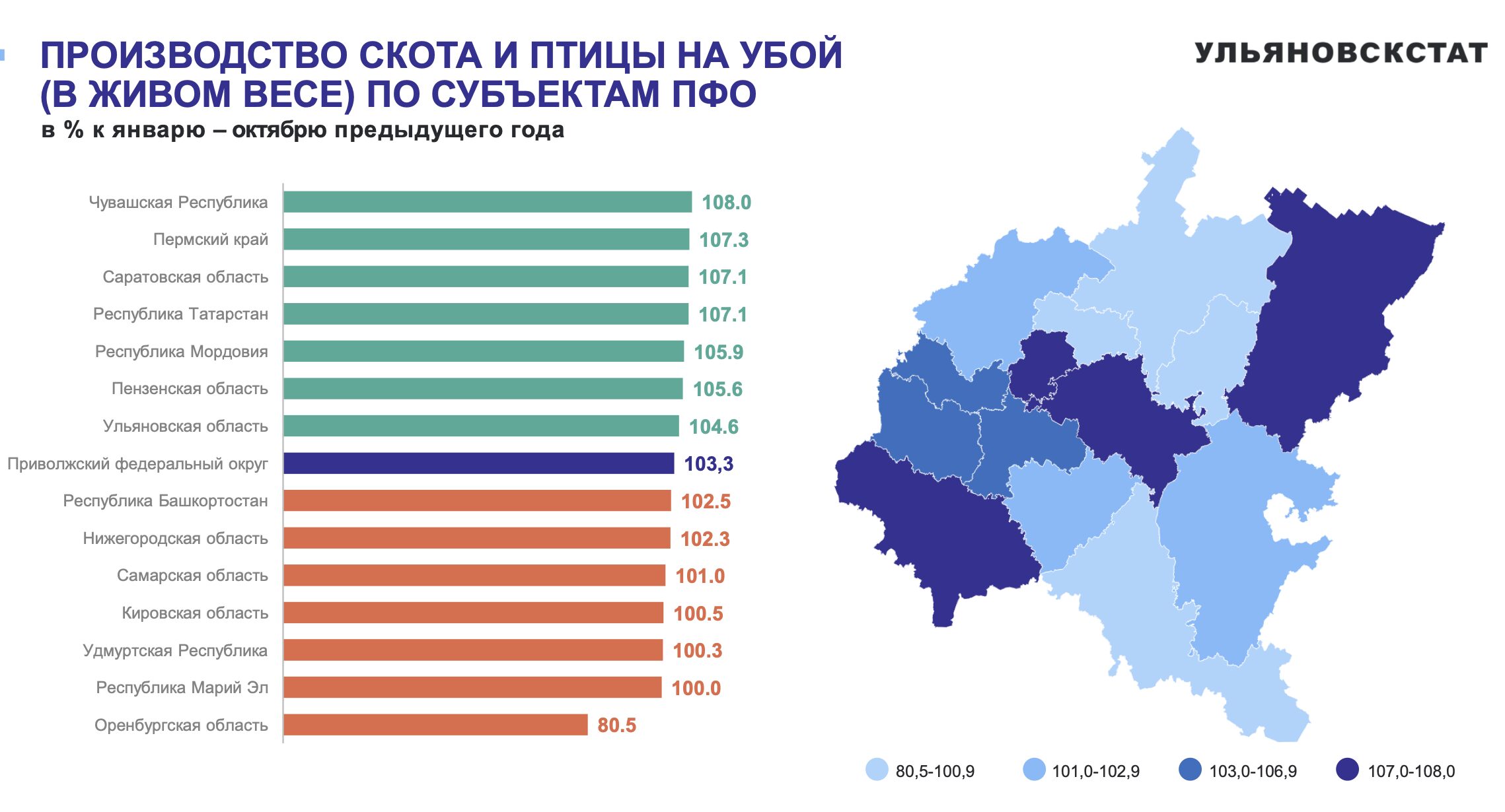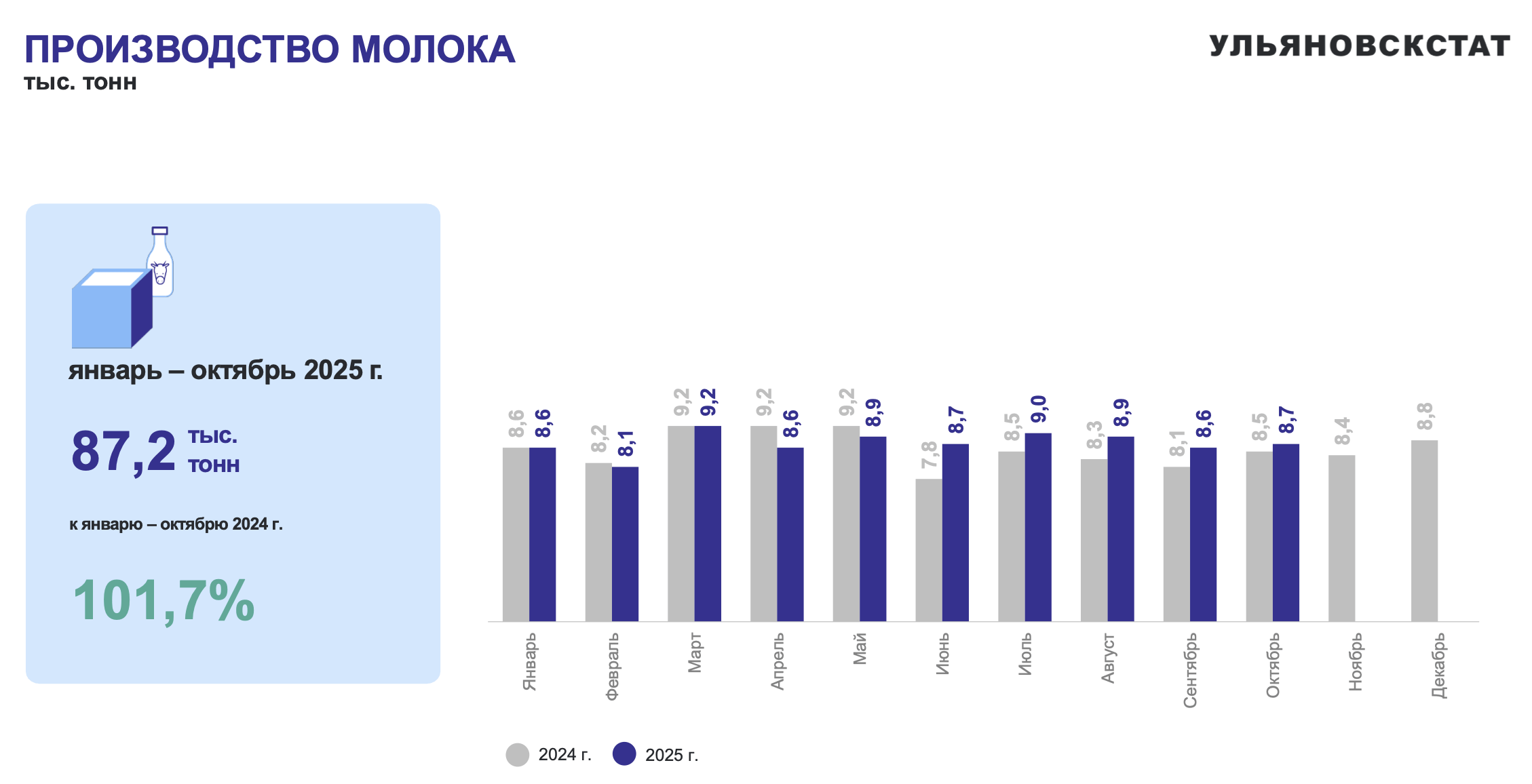 Такая же ситуация – в КФХ региона. Рост объемов производства зафиксирован только в сельхозорганизациях. Также из хорошего – увеличение продуктивности надоев: на одну голову – 7500 килограмм молока, что рекорд для Ульяновской области. Растет производство в аквакультуре – за 9 месяцев рыбоводческие хозяйства увеличили объем товарной рыбы на 20% – до 426 тонн.