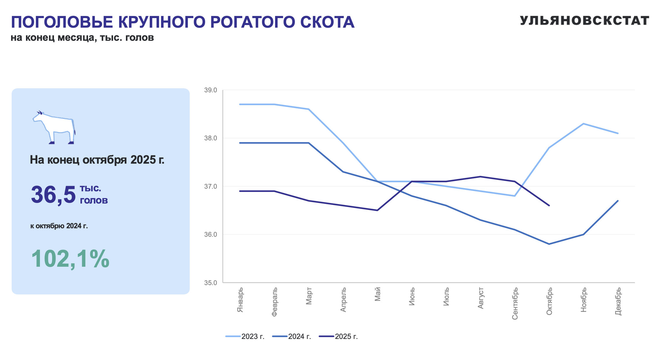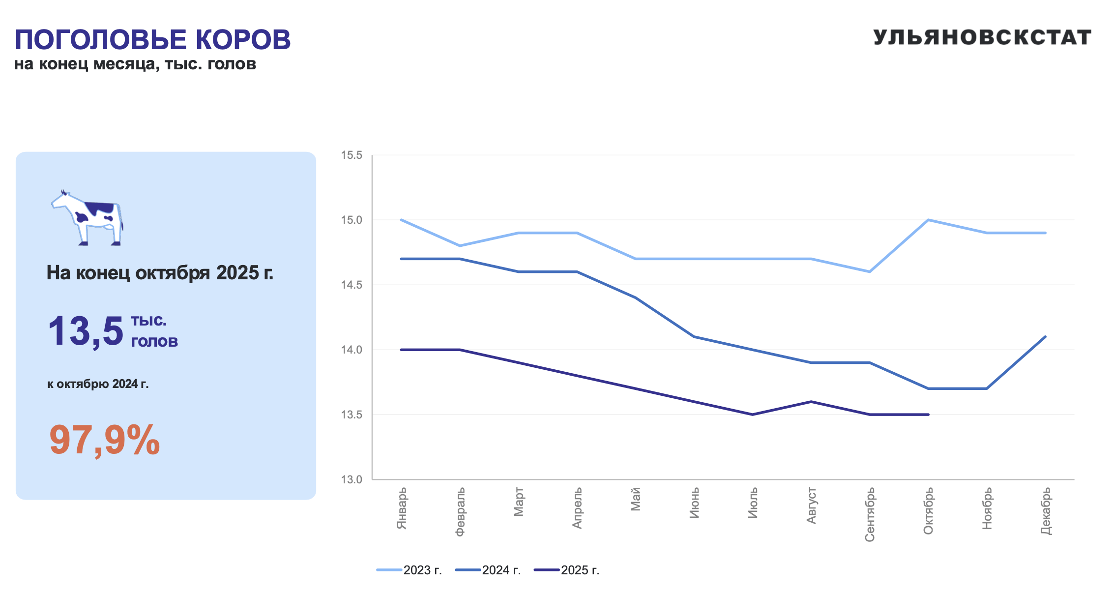 Данные указаны в сельхозорганизациях, где, как упоминалось выше, ситуация не такая сложная, как в КФХ и хозяйствах населения. Хотя и здесь прослеживается резкое падение поголовья коров, по сравнению с 2023 и 2024 годами.