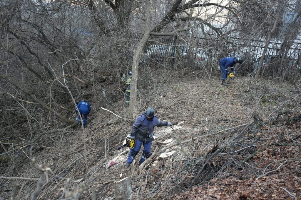 В работах учреждение задействовало автокран, ломовоз и грузовик, а также бригаду пильщиков. При этом важнейшую роль в очистке склона играет поисково-спасательная служба МБУ «Управление гражданской защиты», которая также задействует для подъёма порубочных остатков своё снаряжение.