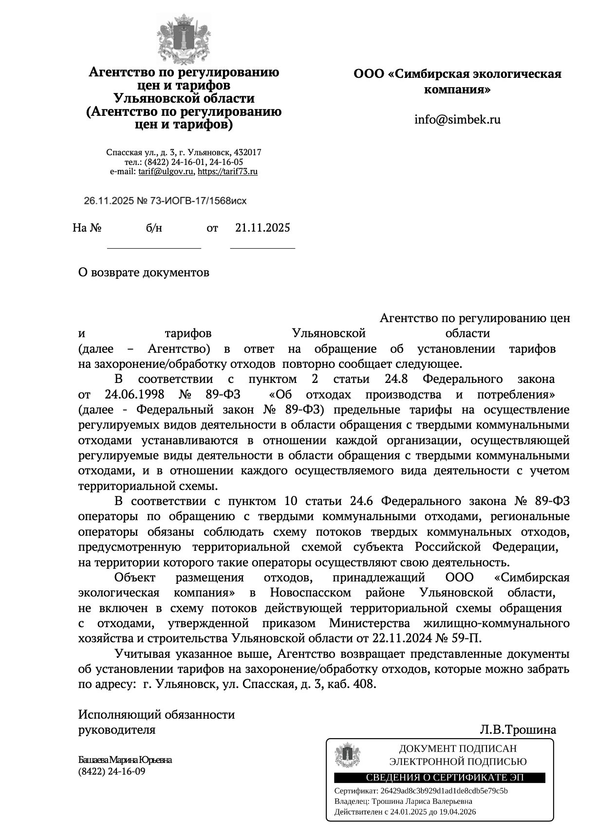 Решение от 25 ноября 2025 года. Улпресса также публиковала мнение Татьяны Большухиной о том, что происходит с территориальной схемой в Ульяновской области. Между темНа портале общественной и антикоррупционной экспертизы выложен проект, устанавливающий порядок присвоения юрлицу статуса регионального оператора по обращению с ТКО на территории Ульяновской области без проведения конкурсного отбора, если он признан несостоявшимся, либо в случае досрочного прекращения деятельности регоператора, в том числе его отказа от осуществления деятельности. Принимать такое решение будет региональное МинЖКХ. |