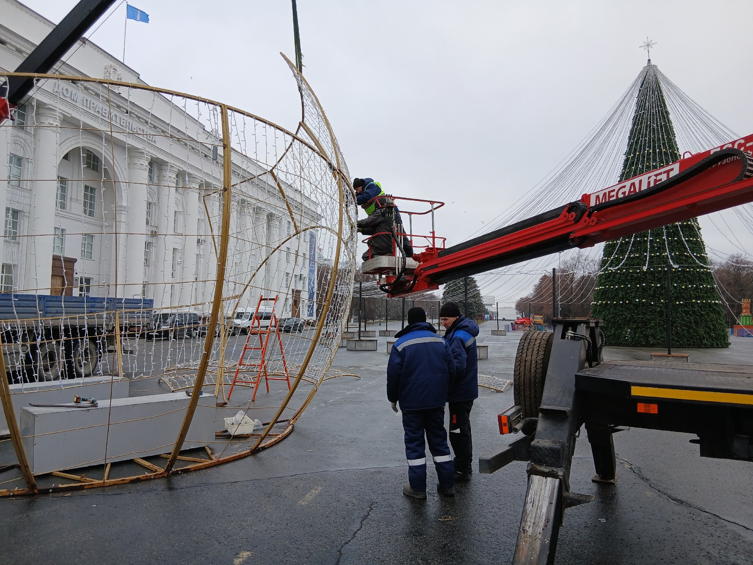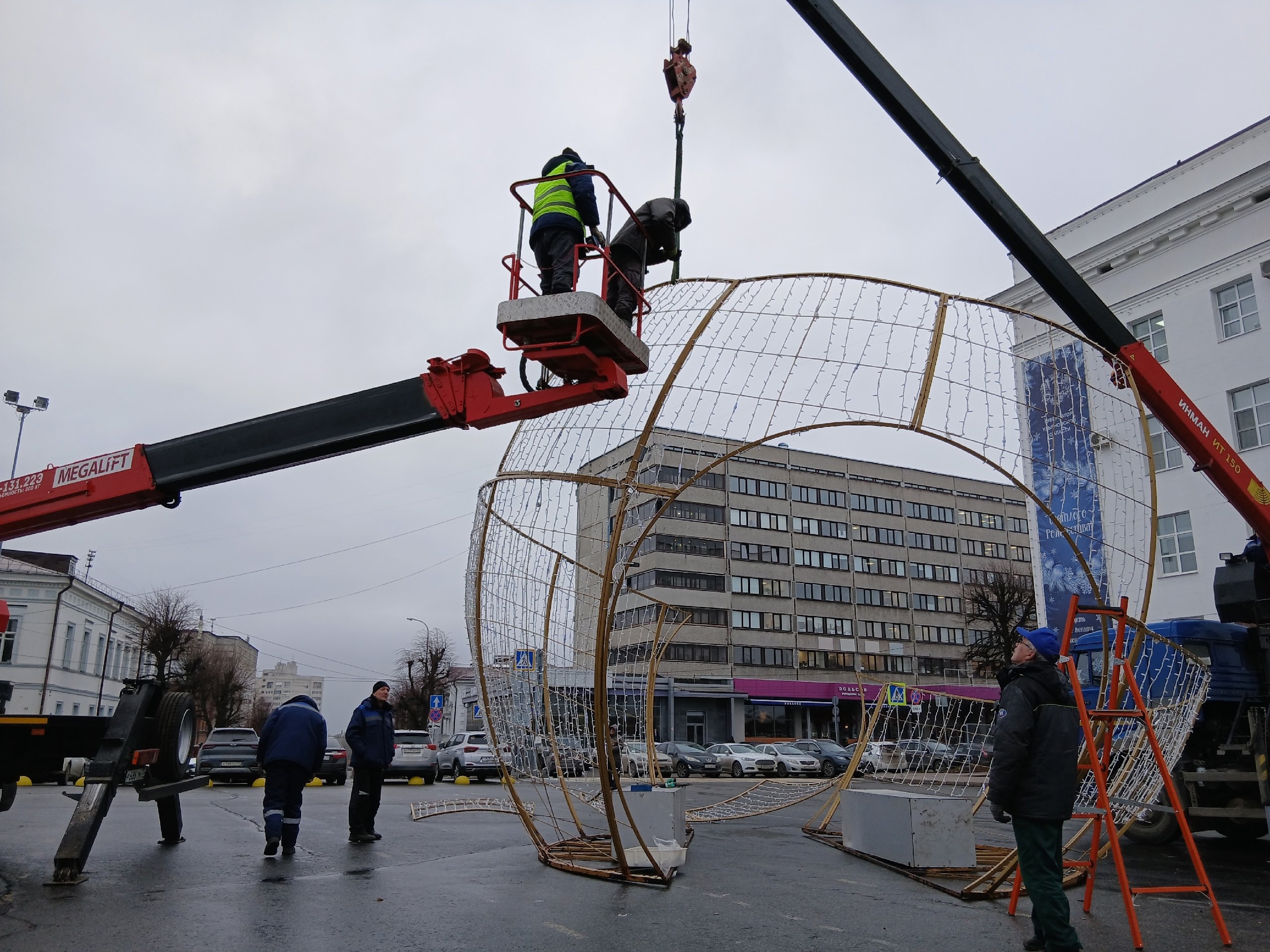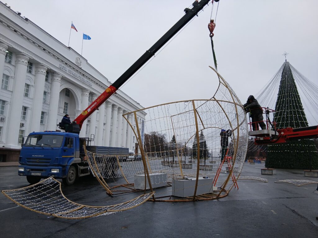 Специалисты «Горзеленхоза» завершают монтаж восьмиметровой световой инсталляции на Соборной площади Ульяновска. Конструкция, напоминающая гигантскую ёлочную игрушку, состоит из двух полусфер, купола и декоративного подвеса-крепления.