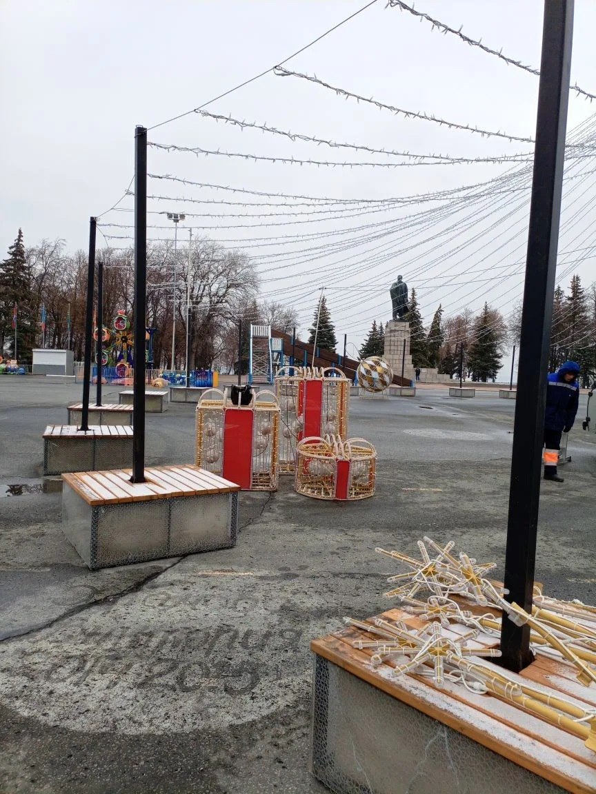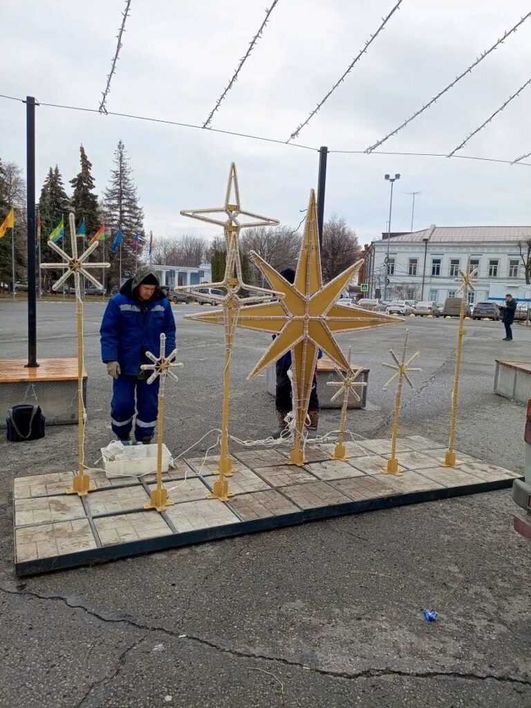Специалисты Городского центра по благоустройству и озеленению установили шесть световых фигур на Соборной площади Ульяновска. В их числе — композиция «Звезды», пара фигур в виде новогодних игрушек и три арт-объекта «Подарок».