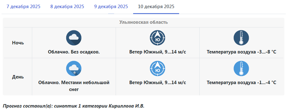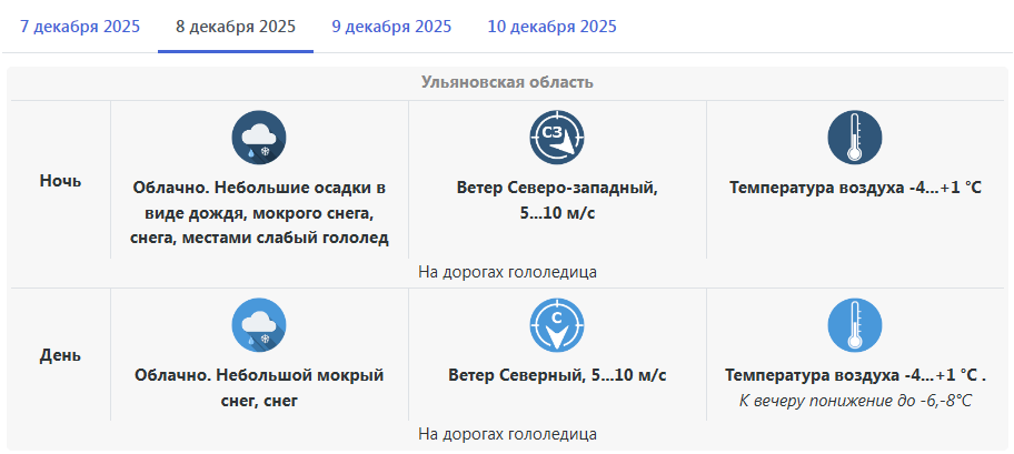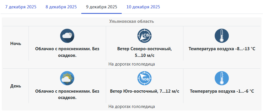 По прогнозу Гидрометцентра, в понедельник на территории Ульяновской области с прохождением холодного атмосферного фронта ожидается снег, поворот ветра на северо-восточное направление и существенное понижение ночной и дневной температуры до климатической нормы декабря. В ночь на вторник температура местами опустится до -13°С. На дорогах сохраняется гололедица.