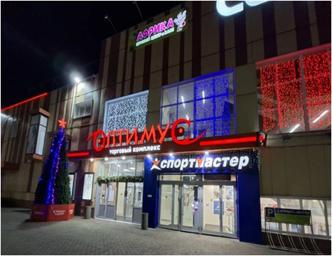 У крупных торговых центров, таких как «Удача», «Самолёт», «Оптимус» и «Созидатель», уже установлены искусственные ели. Фасады ТЦ «Парус», «Сарай», «СтройГрад» и других декорированы гирляндами и световым дождем.