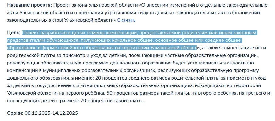 На сайте правительства Ульяновской области опубликован проект изменений в Закон «Об образовании в Ульяновской области». Согласно ему, с началом следующего учебного года должно быть прекращено действие такой меры поддержки как выплата компенсаций за расходы семьям, дети в которых получают общее образование в семейной форме. То есть учатся не в школе — дома, с помощью онлайн-платформ, учреждений допобразования и так далее.
