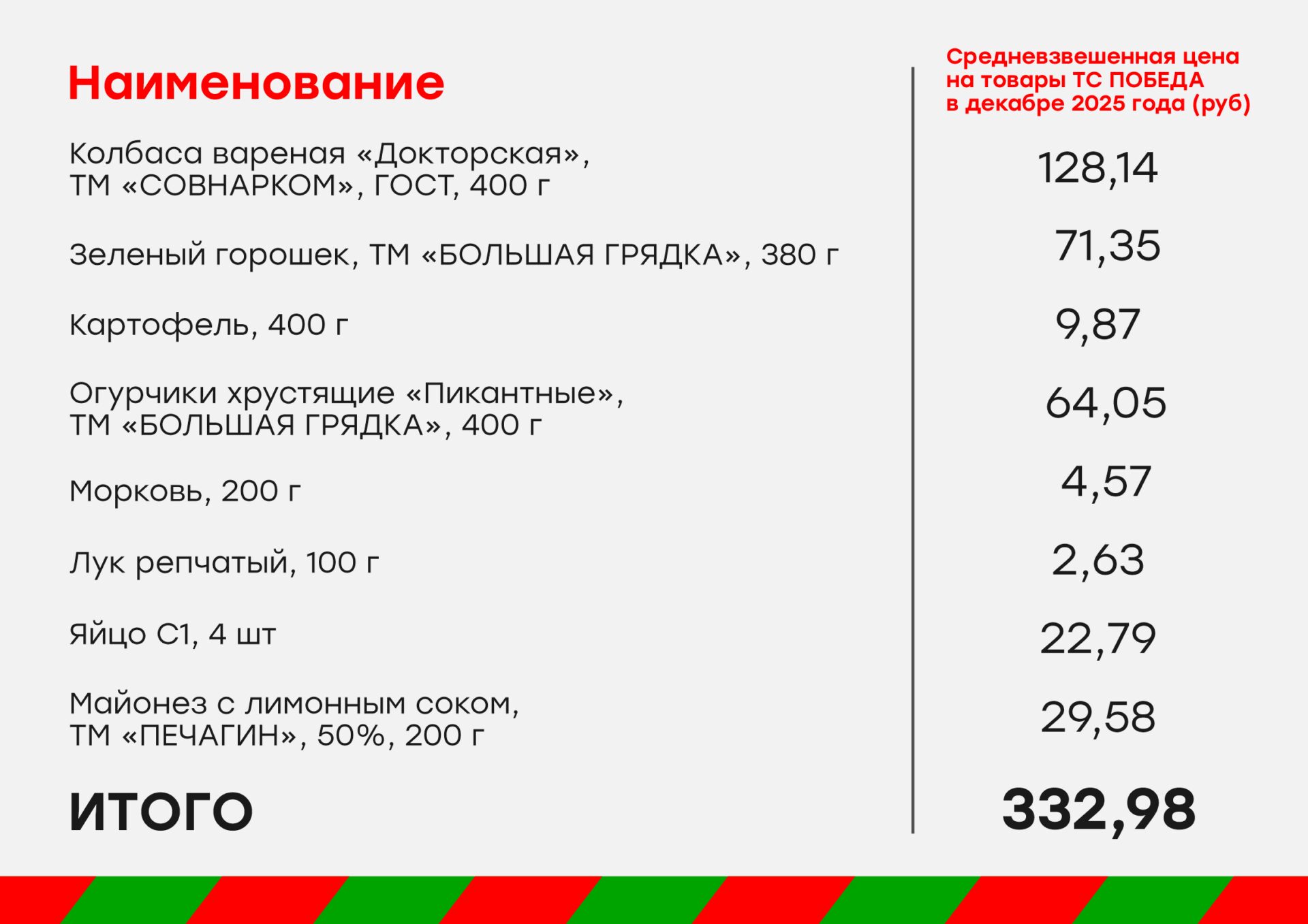А это – для тех, кто предпочитает побюджетнее: стоимость Оливье от дискаунтера «Победа». В магазинах этой сети ингредиенты на четыре порции классического салата подорожали вкупе на 41 рубль (в 2024-ом было 292 рубля).