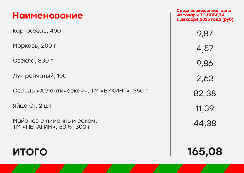 По сравнению с прошлым годом, салат в версии «Победы» подешевел на 56%. Расчет на четыре порции: