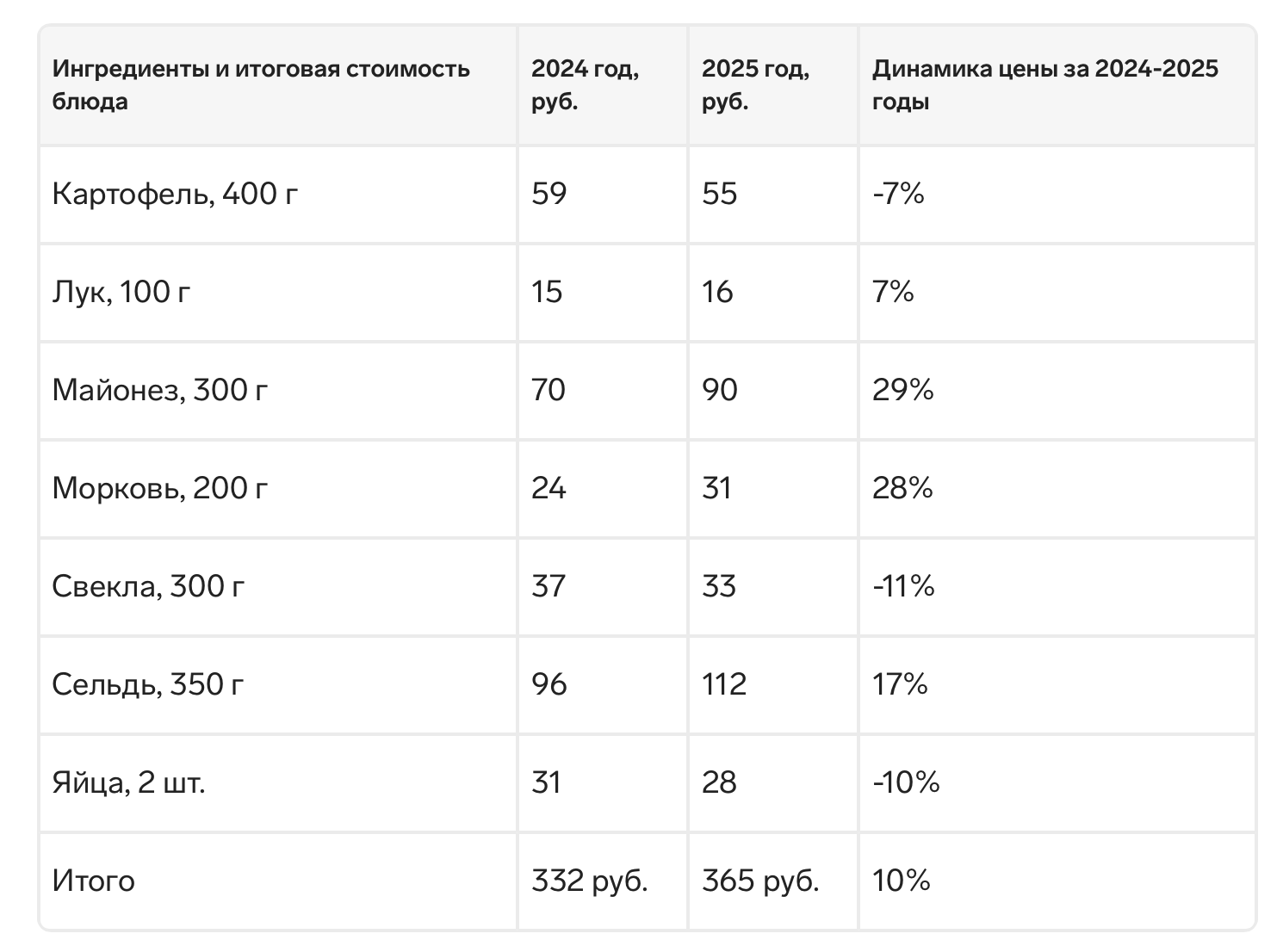 По данным аналитиков «Контур.Маркета», проанализировавших 11 млн чеков по всей стране, стоимость приготовления селедки под шубой на четыре порции в среднем составляет 365 руб (в 2024-ом было 332 руб – рост на 10%).