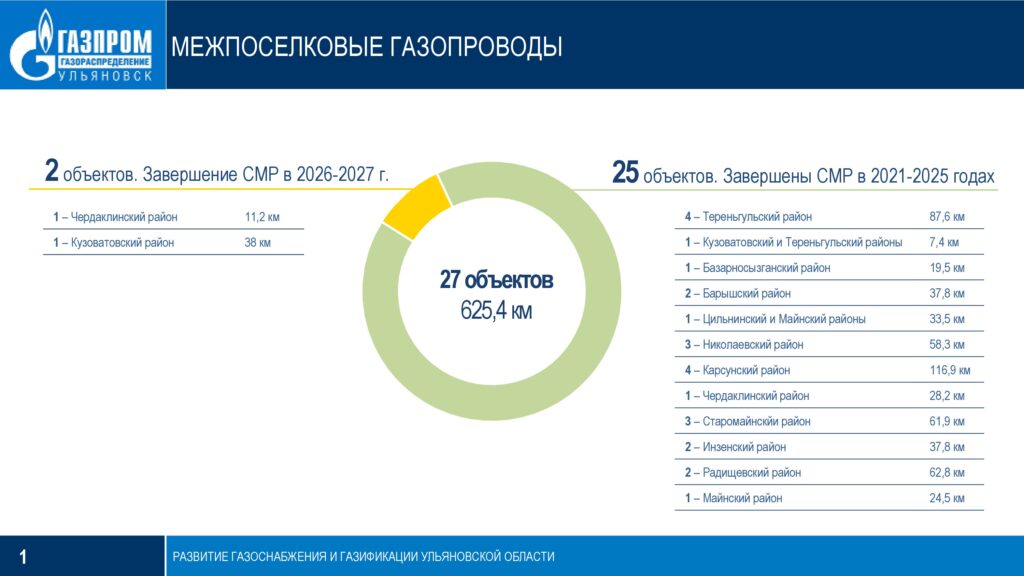 О ходе исполнения пятилетней программы газификации доложил губернатору Алексею Русских гендиректор «ООО Газпром межрегионгаз Ульяновск» Владимир Камеко на штабе по развитию Ульяновской области. Программа ставила задачи построить 27 межпоселковых газопроводов общей протяженностью более 625 км.