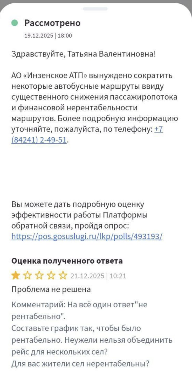 В Ульяновской области разработают региональный комплексный план транспортного обслуживания населения. Проект соответствующего постановления правительства выложен на сайте общественной и антикоррупционной экспертизы. В документе указаны основные стратегические моменты — как планируют развивать общественный транспорт в муниципалитетах. В числе планируемых новшеств — отмена ряда маршрутов общественного транспорта, следующего до ульяновских сел. Изучили проект и узнали мнение экспертов и жителей глубинки. Региональный комплексный план транспортного обслуживания, а также связанный с ним региональный стандарт, будут принимать сроком на пять лет. Для их разработки предполагается привлекать, «в соответствии с законодательством о контрактной системе в сфере закупок товаров, работ и услуг для обеспечения государственных и муниципальных нужд», подрядчиков для выполнения научно-исследовательских работ. Судя по всему, область идет по пути города, который недавно получил материалы по комплексному развитию транспортной отрасли от компании «Симетра» — Улпресса подробно об этом писала. Что сейчас содержится в проекте? В ближайшие пять лет в регионе будут менять и отменять межмуниципальные маршруты регулярных перевозок, развивать на пассажирском транспорте интеллектуальную систему, обновлять подвижной состав. И вот что конкретно предложено изменить или отменить. По каким причинам выбраны именно эти маршруты, как быть жителям «отмененных сел» — будут ли там курсировать проходной общественный транспорт, на какой класс подвижного состава хотят пересадить пассажиров, следующих до Карсуна, Сурского и других населены- пунктов, в проекте не указано. На запрос Улпрессы в областном Минтрансе ответить на момент публикации не смогли. Между тем, о кризисе общественного транспорта жители муниципалитетов говорят давно. В том числе, в райцентрах и малых городах. Жительница Инзы на днях получила ответ из местного АТП. Перевозчики сообщили, что ряд маршрутов сокращены из-за нерентабельности и снижения пассажиропотока. — Гнать всю нашу администрацию района поганой метлой из здания, как НЕРЕНТАБЕЛЬНУЮ. Вот где проявляется истинная забота о народе, а не в парках. Жители сёл для администрации района нерентабельны? А ВЫ с вашими зарплатами, служебными авто РЕНТАБЕЛЬНЫ? Стыдно должно быть, господа!, — эмоционально высказалась горожанка в телеграм-канале местного врача и активиста «Товарищ Плигузов». Судя по комментариям, в Инзенском АТП хотят сократить маршрут №217 (Аристовка — Инза) и убрать 2-й рейс в 11-25. Местные жители говорят, что им это неудобно: