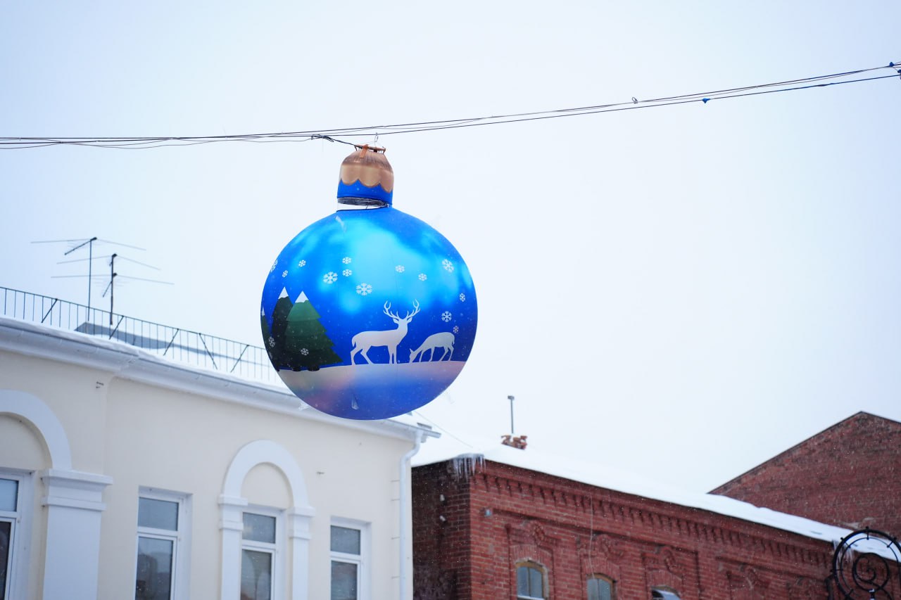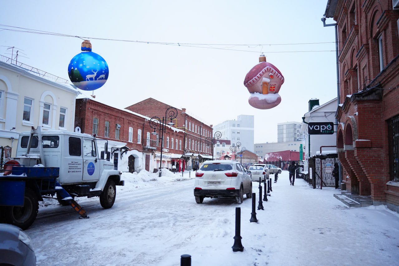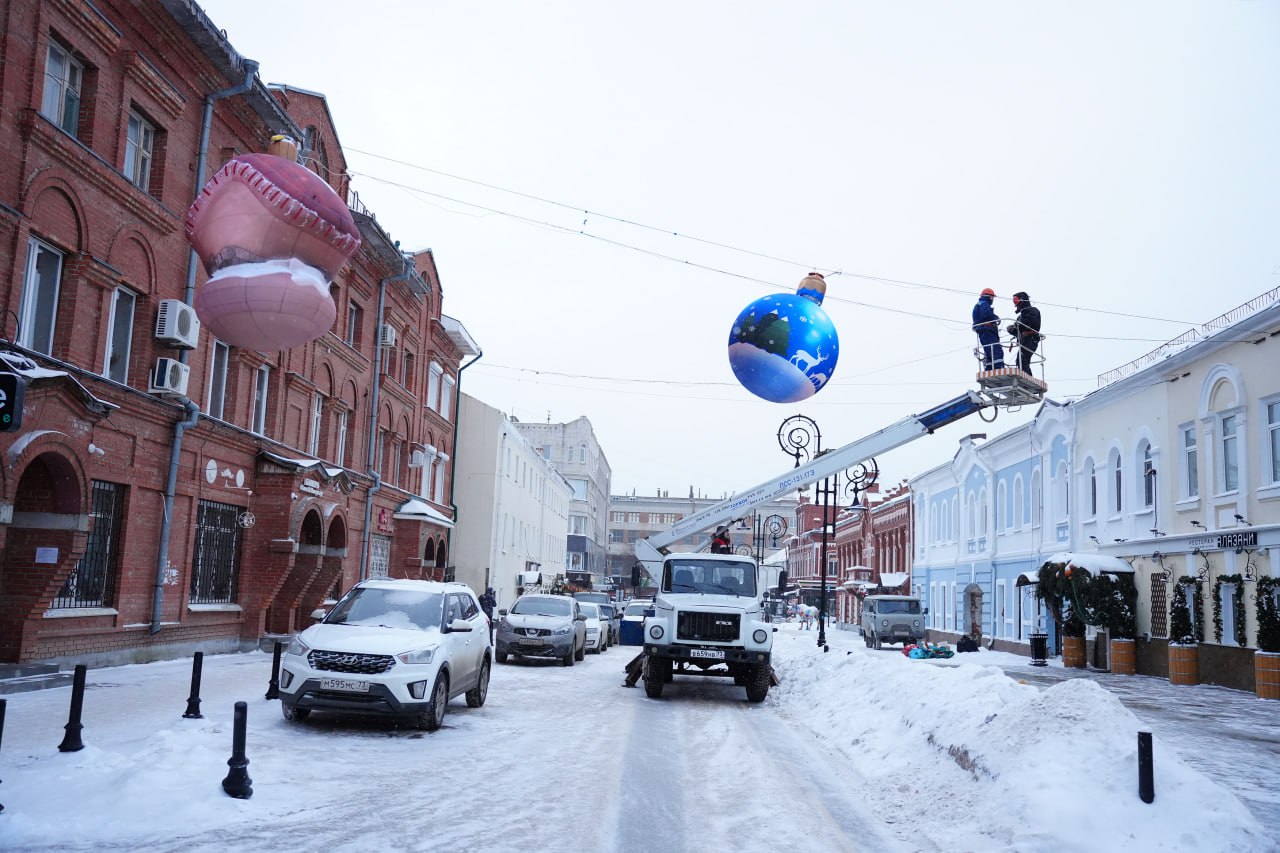 В центре Ульяновска продолжается праздничное оформление. На улице Федерации специалисты городских служб приступили к монтажу новых подвесных конструкций.