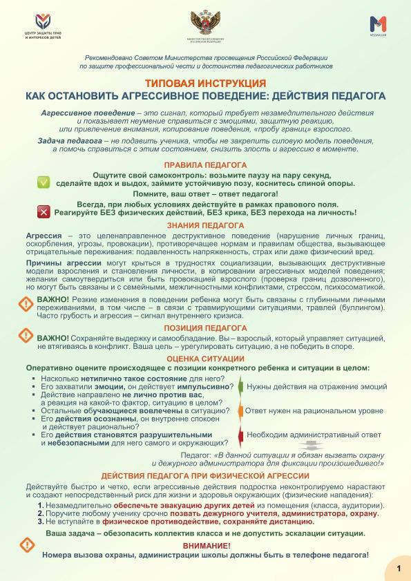 Министерство просвещения Российской Федерации направило в регионы инструкции для руководителей образовательных организаций по действиям в конфликтных ситуациях у педагога. Документ был одобрен на заседании Совета Минпросвещения России по защите профессиональной чести и достоинства педагогических работников.