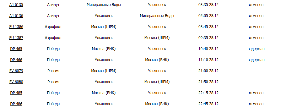 Согласно данным онлайн-табло аэровокзала, отменены рейсы авиакомпаний «Азимут», «Аэрофлот» и «Победа» из Минеральных Вод и Москвы в Ульяновск и обратно, задержаны рейсы авиакомпании «Победа» из столицы и обратно.