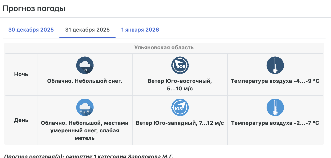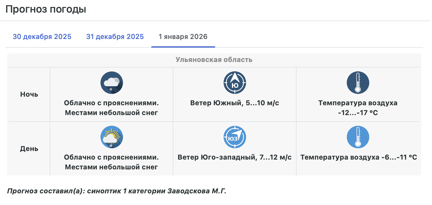 ночь нос с 31 декабря на 1 января температура воздуха опустится до -9 градусов. Ожидается небольшой снег и ветер до 10 м/с. Ночью 1 января столбик термометра опустится до -17 градусов.