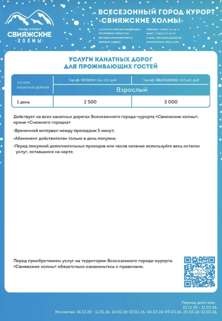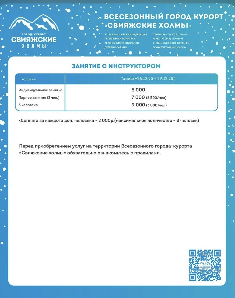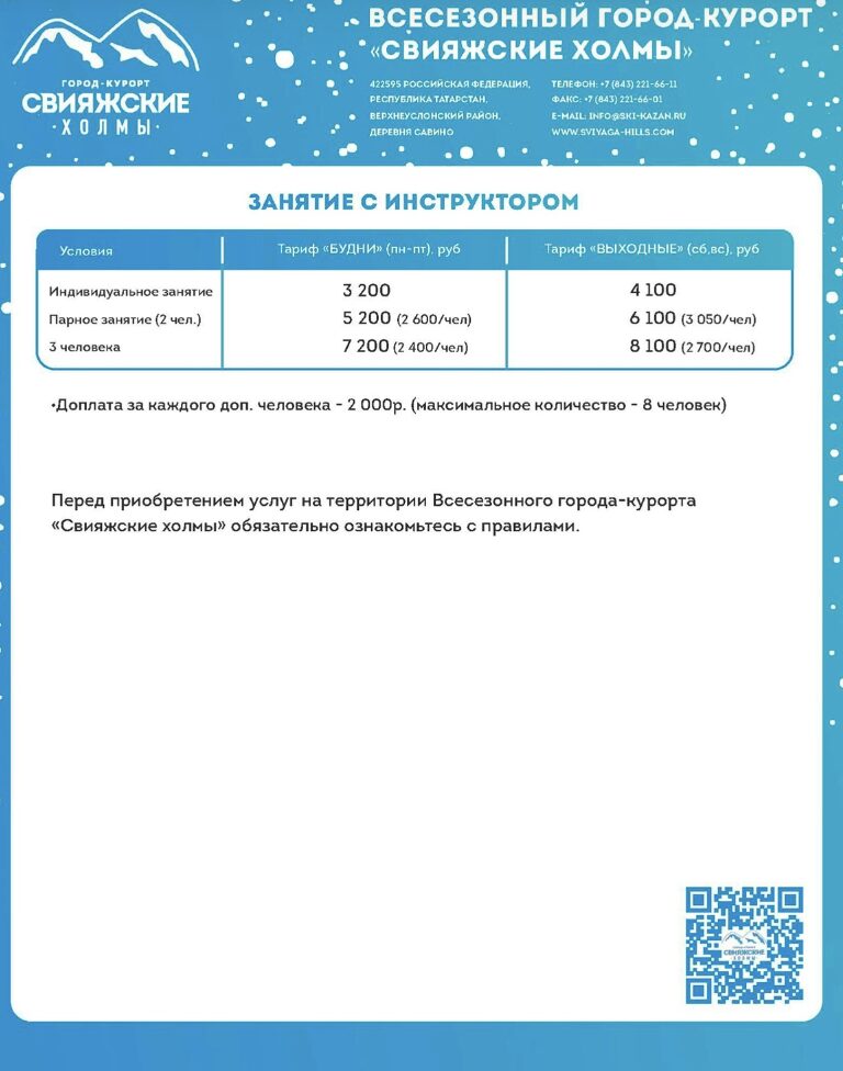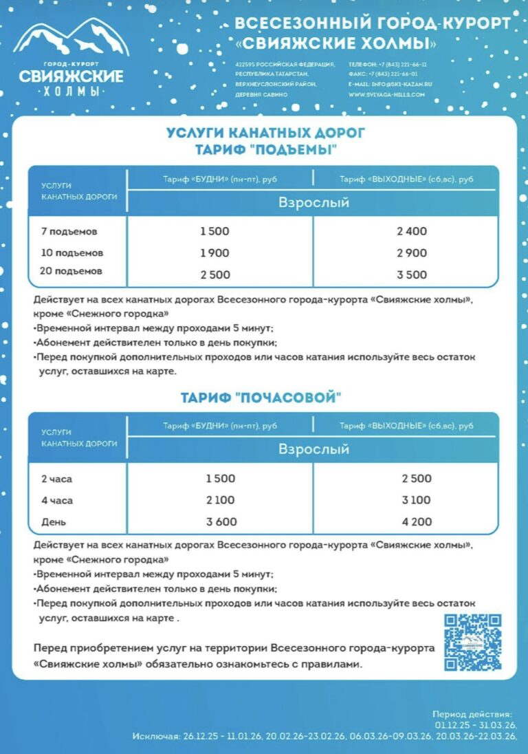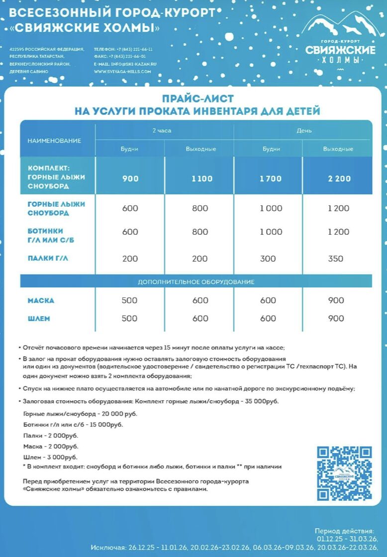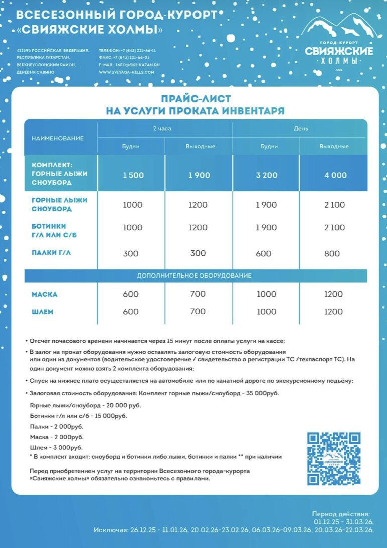 Для детей и пенсионеров скидка: пользование подъемником на 1, 2 и 3 часа в будни стоит стоит 250, 350 и 450 рублей соответственно. Прокат оборудования начинался от 150 руб (за час) – лыжи, и столько же – ботинки, по 200 руб – сноуборд и ботинки, по 100 руб – шлем и палки, 400 руб – сноутюб. Обучение с инструктором – 2500 руб за час. Последние новости публикуются в группе ГЛК ВКонтакте. Где уже можно покататься на горных лыжах?Всесезонный город-курорт «Свияжские холмы»Горнолыжный сезон в Татарстане открылся 19 декабря; учебная трасса начала принимать желающих покататься 21 декабря, красная – 27 декабря. Здесь есть несколько трасс: