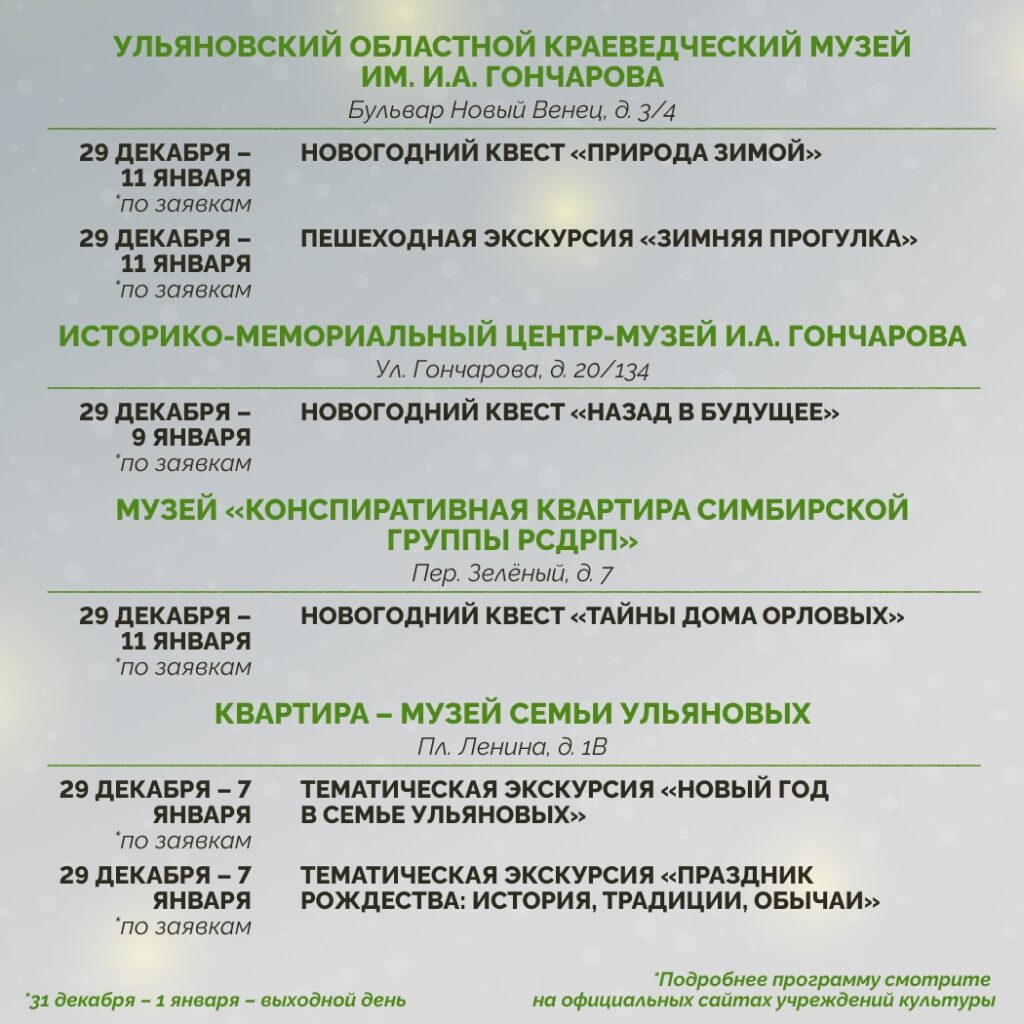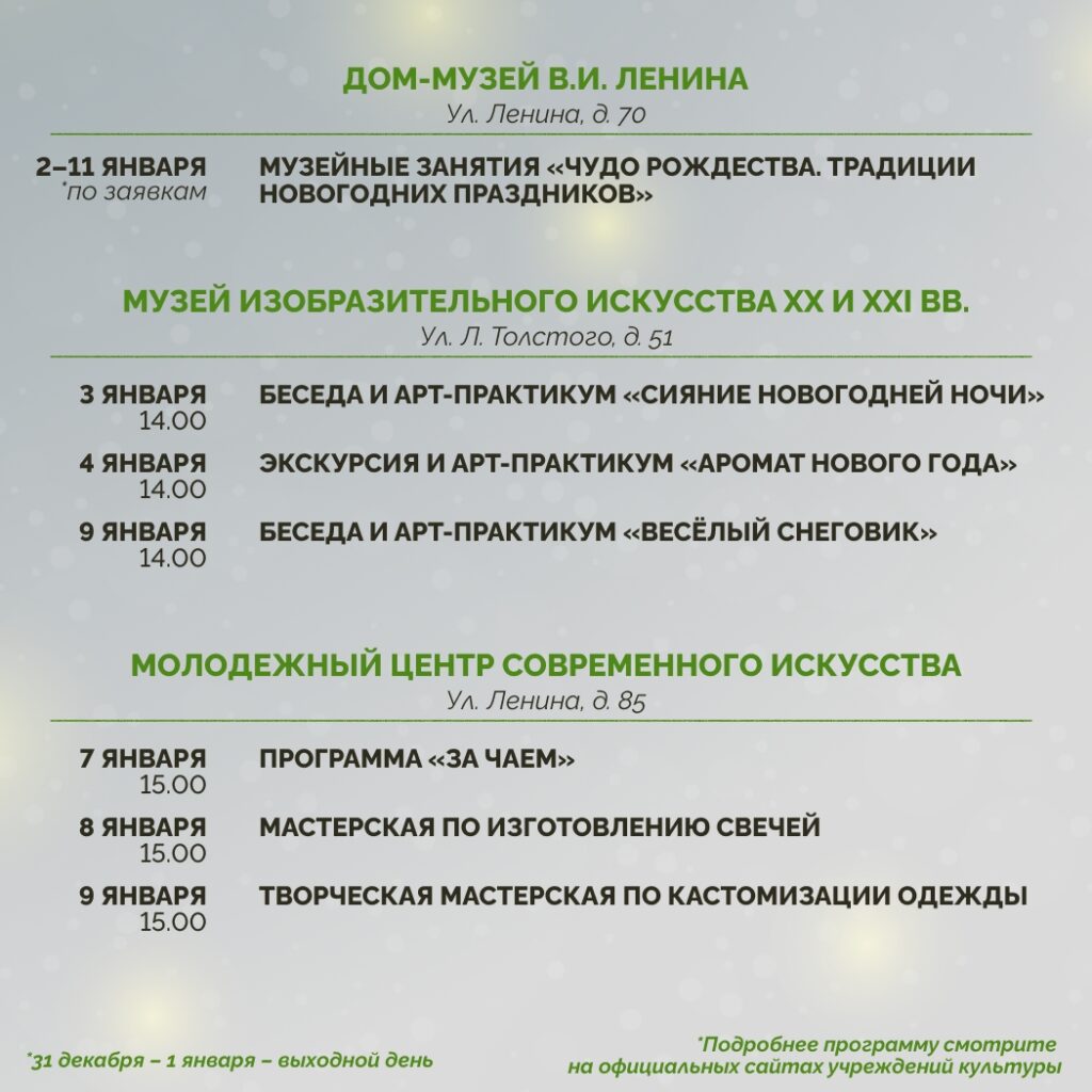 Культурные учреждения Ульяновска подготовили для горожан мероприятия для интерактивного и познавательного проведения досуга в новогодние выходные. В программе — творческие мастерские, лекции и тематические встречи.